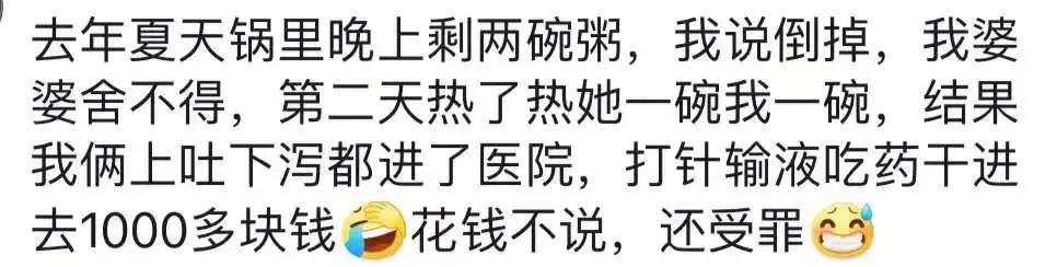 有婆婆舍不得扔掉夏天的隔夜粥,第二天吃了上吐下泻,进医院打针输液吃药花了一千多;