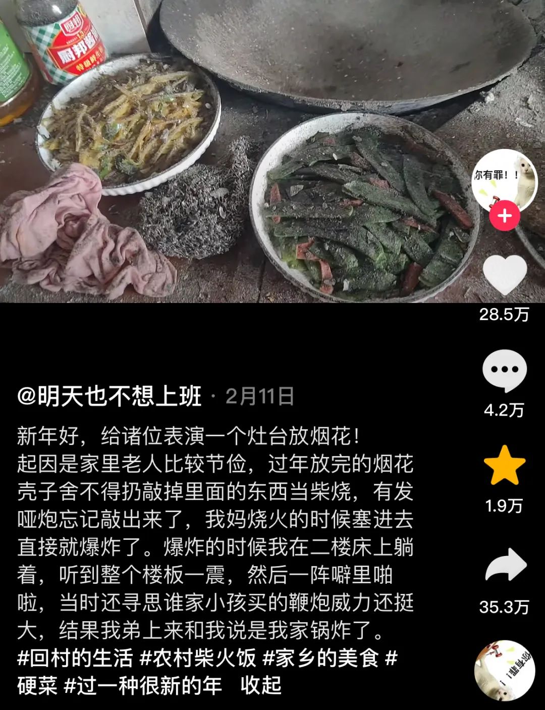 没想到里面有个哑炮,结果炉灶爆炸了,菜只能全扔了。