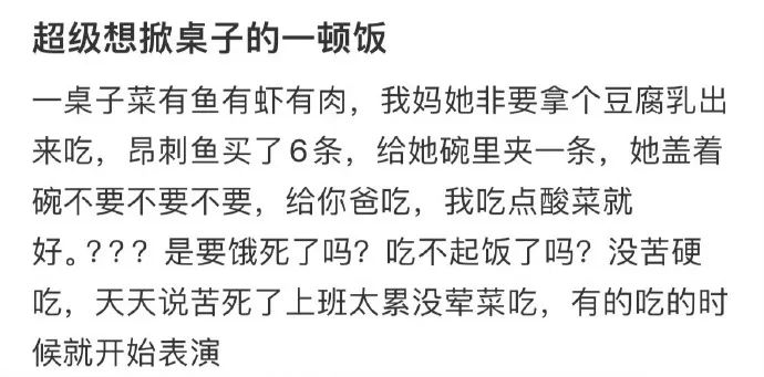 还天天说自己苦死了,上班太累没荤菜吃,但有的吃的时候就要来一套这样的表演。