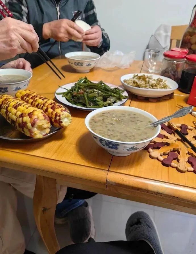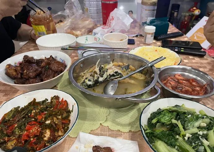 有人也拍下了自家的饭桌,有鱼有虾有肉,但妈妈偏要拿个豆腐乳出来吃。