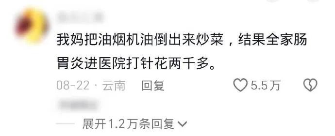 有妈妈把油烟机里的油导出来炒菜,结果全家肠胃炎,进医院打针花了两千多;