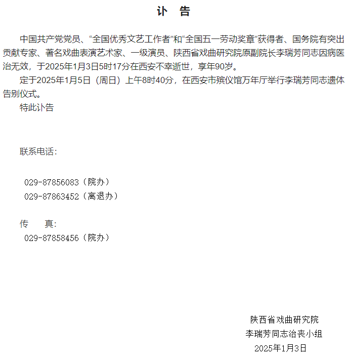 1月3日,陕西省戏曲研究院发布讣告:“全国优秀文艺工作者”和“全国五一劳动奖章”获得者、著名戏曲表演艺术家、一级演员、陕西省戏曲研究院原副院长李瑞芳同志因病医治无效,于3日逝世,享年90岁。