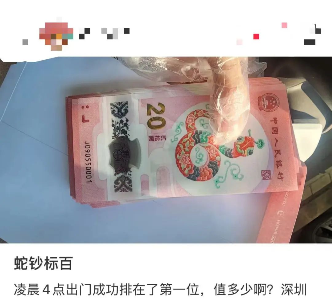 “出20张蛇年纪念钞,先到先得。”记者以消费者的身份在上述平台上询问蛇年纪念钞的价格时,一位卖家表示,他早上刚从银行取回来20张蛇钞,目前还没想好出售价格,想对比下买家的价格再出售。