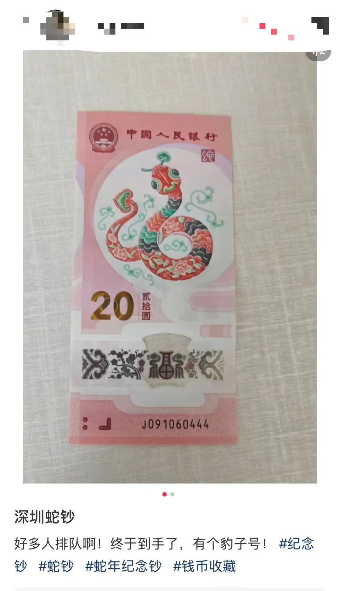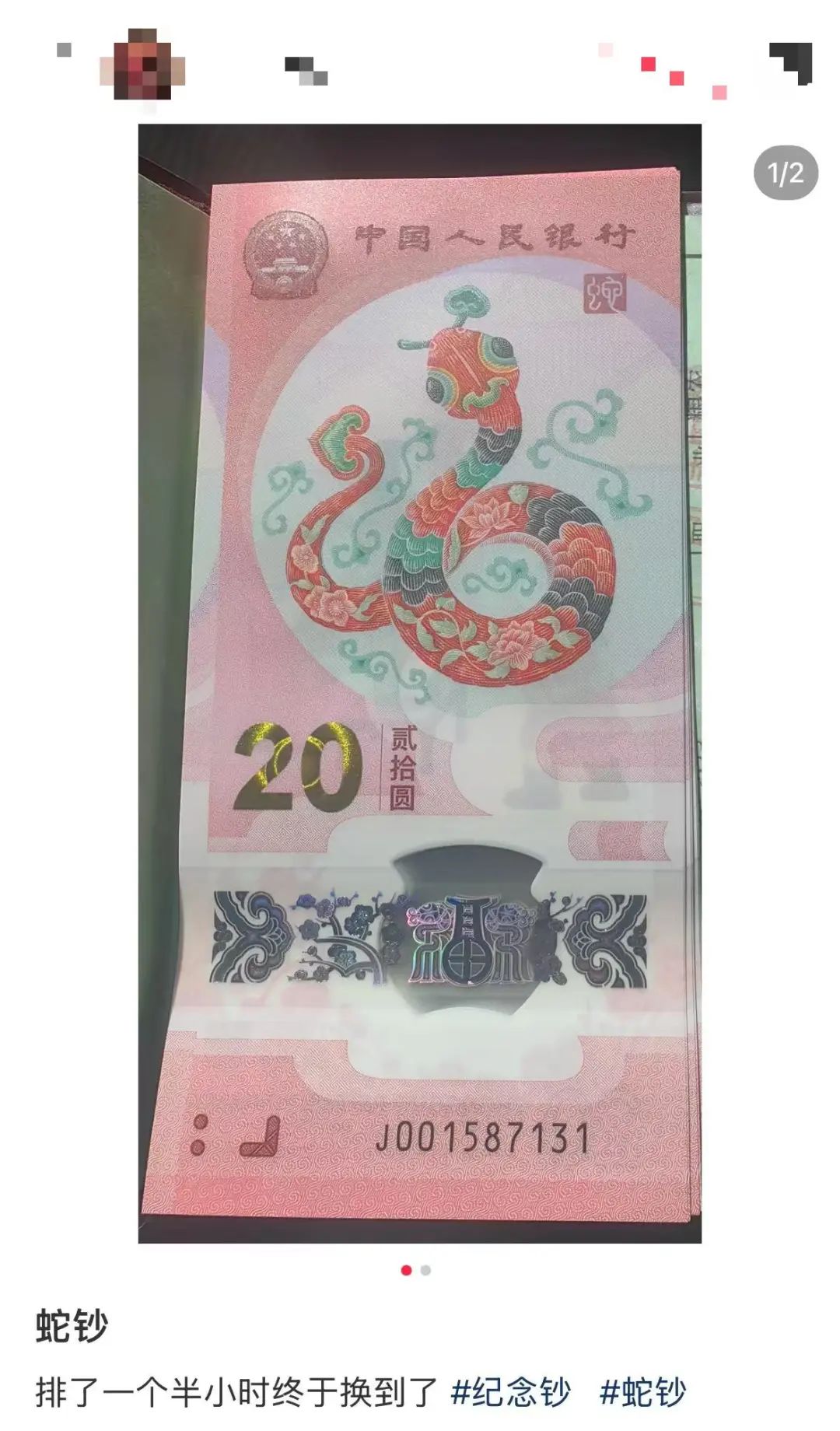 此外,蛇钞是贺岁系列纪念钞的第2张生肖纪念钞。此前精美的“龙钞”曾引发关注,鲜艳的颜色、亮丽的图案、美好的寓意,都为“龙钞”加了把火。由于人气火爆,部分银行系统一度出现宕机,“龙钞”被冠以“史上最难预约”纪念钞。面值20元的龙钞,发行当日在二手市场的价格已达40元附近。