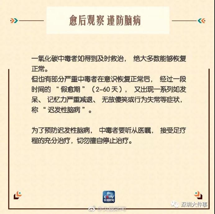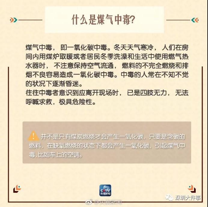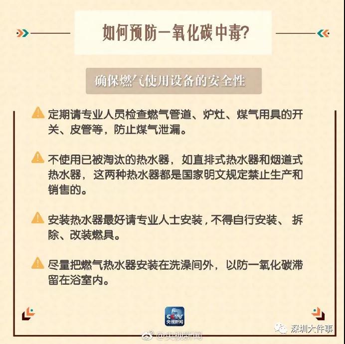 这几天深圳天气又升温 中午气温又“奔3” 但早晚天气还是凉飕飕的 晚上来个暖暖的热水澡 那也是舒服爽快了~ 但是 小编还是要提醒 洗澡请务必注意安全 小!心!煤!气!中!毒! 南都记者了解具体情况 深圳一年轻女子 出租屋内洗澡时中毒身亡 “真的,假的?”16日下午一点多,下水径租户群弹出一条令人惋惜的消息。消息显示,该社区一区某巷某楼房发生一起煤气中毒事件,死者为一名姓詹的潮州女子。信息的落款是吉华街道办应急指挥中心。 此外,该消息还披露了事故原因,死者在出租屋内使用直排热水器煤气中毒致死。 进入浴室洗澡迟迟未出来 家人发现时,女子已不省人事 据邻居卢先生反映,16日凌晨零时左右,他突然听到楼上传来哭声,现场急救人员正在抢救一名昏迷的年轻女子。 据其反映,15日晚十点多,女子进入浴室洗澡,但却迟迟未出来,家人觉察到异常,遂打开浴室,结果发现女子已躺在地上,不省人事。“当时热水器还在工作”。 图片来源:视觉中国 随后,家属叫了救护车。急救人员在楼道上对女子进行了长时间的抢救,“很可惜女子还是没救过来”。据卢先生反映,女子年纪不大,“大概18、19岁的样子”,和家人一起租住在下水径村。 从卢先生提供的住户群信息还显示,下水径社区工作站要求,尚在使用直排热水器的住户向工作站报备,同时工作站也及时开展排查工作。 南都记者 也向警方了解具体情况 警方: 经初步调查 事件已排除他杀 南都记者从龙岗警方获悉,经警方初步调查,事件已排除他杀。 南都记者从吉华街道了解到,11月16日凌晨,吉华街道水径社区下水径一区12巷一出租屋内发生一起气体中毒事件,事故原因目前在调查中。 事故发生后,吉华街道领导高度重视,立即组织街道职能部门及各社区工作站开展用气安全地毯式排查行动,杜绝类似事件发生。 这样的事故 让人感到十分惋惜 而洗澡时中毒 在深圳并不是第一次发生 深圳曾有青年 凌晨洗澡中毒身亡 去年冬天 深圳就接到多起 一氧化碳中毒急救电话 2019年12月1日-10日,9天共接到7宗9人一氧化碳中毒报警。 ◎ 2019年12月3日21时51分,光明区有孩子父亲报警称他的2个孩子洗澡后,分别出现了头晕、乏力等症状。这两个孩子,一个5岁,一个7岁。 ◎ 2019年12月4日20时45分,福田中心区某小区,一名32岁的男子称他和女友洗澡后,均出现疑似一氧化碳中毒症状需要救护车。 幸运的是,这些最终确诊为一氧化碳中毒的患者,抢救及时均已脱险,否则后果不堪设想。 而在2017年 深圳更有年轻男子 洗澡时煤气中毒,抢救无效死亡…… 2017年10月28日凌晨3点多,深圳120接到龙华观澜市民报警,称有人“煤气中毒”。120迅速出车,但急救医护人员到达现场时,发现一名22岁的年轻男子已无力回天。 由“直排式热水器”引发的中毒 过往在各地都有发生过 什么是“直排式热水器”? 用这种热水器有什么风险? 下面这些赶紧来看看! 目前 市场上只要有三种燃气热水器 直排式热水器 热水器内本身没有吸气和排气的装置,自然进气、排气,取氧和排气都在室内,容易造成浴室内缺氧,及废气浓度过高。 国家早已禁止生产和销售直排式热水器,现在市场上买到的基本上都是二手翻新货及山寨小厂货。 强排式热水器 自然进气,内置排气扇往外排出废气,相对安全,但也因吸取浴室内空气,可能造成缺氧。 强排式热水器,只是把燃烧产生的废气强制性地排出冲凉房以外,但它燃烧消耗的氧气还是直接取自室内,所以时间长了,仍然会缺氧。 平衡式热水器 通过双层排气管与外界相通,内置两个排气扇,一个负责从室外吸入供燃烧的空气,一个负责将废气排到室外,安全性相对较高。 平衡式热水器是最理想的,它燃烧使用的是室外的空气,不会消耗室内的氧气,产生的废气也强制排到室外。 而这其中 “直排式热水器” 为何成为“凶器”? ▼ 热水器在烧水时吸入室内空气参与液化石油或天然气燃烧,耗费室内空间中的氧气。 燃烧过程产生一氧化碳、二氧化碳等废气,直接排放在室内空间。 氧气耗尽,有毒气体浓度升高,如果恰好浴室内密闭,空气不流通,人吸入时间过长,直接导致一氧化碳中毒,严重者失去生命。 所以 如果你家在使用“直排式热水器” 请立刻马上换掉! 图片来源:视觉中国 而在使用其他的燃气热水器时 需要注意什么? 大家也别大意~ ▽ 1、热水器应安装在厨房内,严禁安装在浴室内,用户不得自行拆、改、迁、装。 2、安装热水器的房间应有与室外通风的条件,防止一氧化碳或其他有毒气体的中毒。 3、在每次使用前,都应检查安装热水器的房间窗户或排气扇是否打开,通风是否良好。 4、连续使用热水器的时间不应过长;一旦出现头痛、头晕、恶心、呕吐、心悸、四肢无力等症状应立即打开门窗,使室内通风。 5、烟道式和强排式热水器未安装烟道的不得使用。 6、当热水器出现火焰发黄、冒烟、有刺激性气味等现象时,应停止使用并进行维修。 7、当热水器出现异常情况(着火、爆燃、漏水、漏气、噪声、震动等),立刻关闭燃气阀和水阀。 此外 关于一氧化碳中毒都有哪些症状? 也一起来看看! ▼ ☞ 轻度中毒: 会造成心动过速、短暂昏厥。 ☞ 中度中毒: 除心动加速、昏厥加重外,口唇、指甲、皮肤粘膜出现樱桃红色。 ☞ 重度中毒: 患者则会迅速进入昏迷状态,并有阵发性强直性痉挛;晚期肌张力显著降低,最后因呼吸