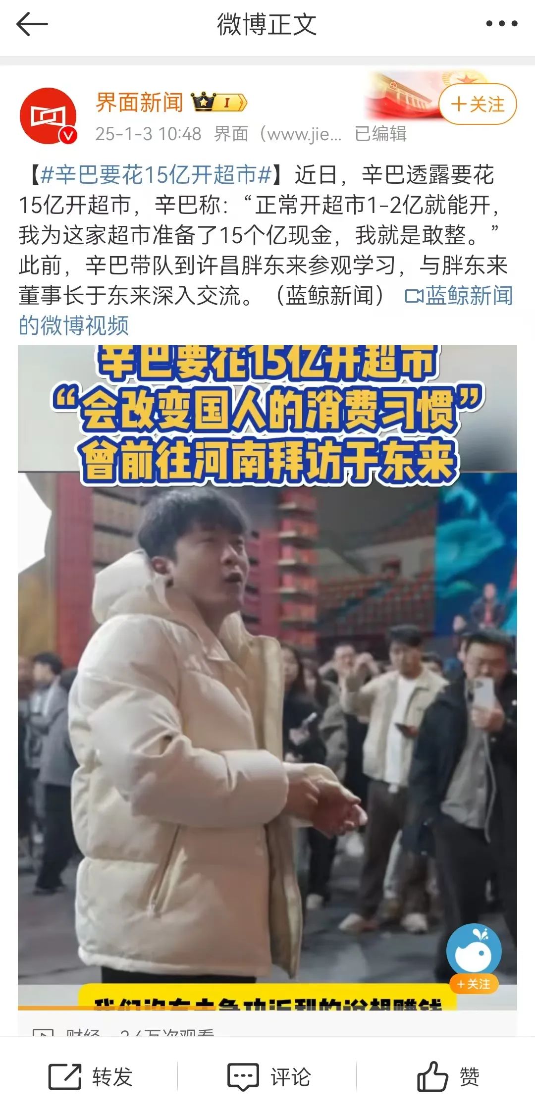 辛巴此行的目的很明确:考察学习胖东来的经营模式,为自己即将开启的超市项目积累经验。