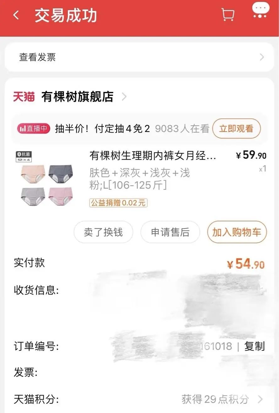 据新闻报道,记者注意到,博主提到的“有棵树”生理期防漏内裤4条售价59.9元,目前仍在售。该商品详情页介绍,裆部材质部分为100%棉。“共有三层防漏设计,第一层能瞬间吸收,第二层防止水分渗透,第三层稳定包围稳稳兜住安全感”。