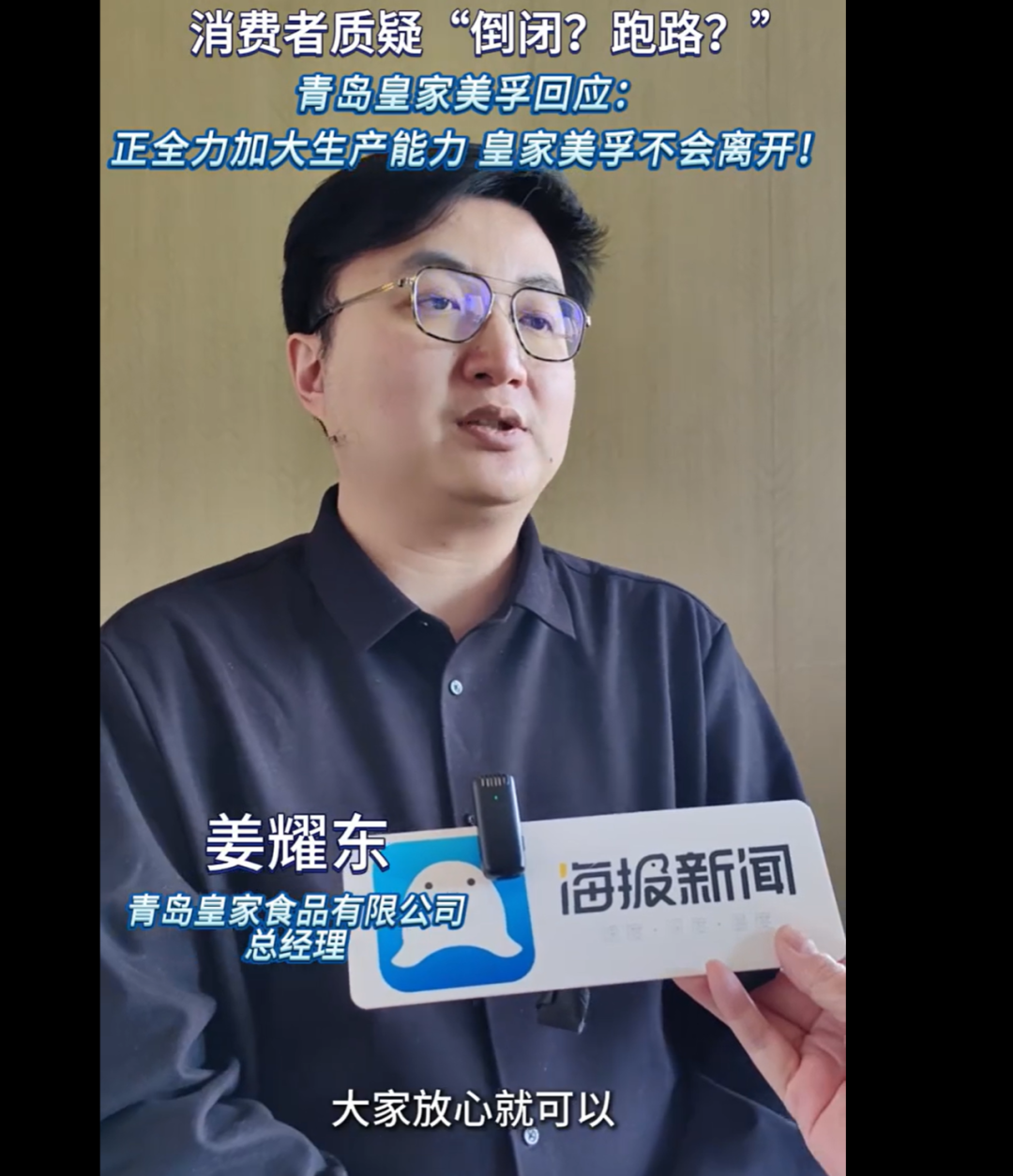 另外,据大众网报道,记者采访了青岛皇家食品有限公司总经理姜耀东,他表示:“公司正全力加大生产力度,保障满足消费者的需求,也请大家相信公司的实力和我们做好这个企业的决心。作为皇家美孚的负责人,如上我是可以保证的。只是希望大家在选购商品时注意安全,不要着急。”
