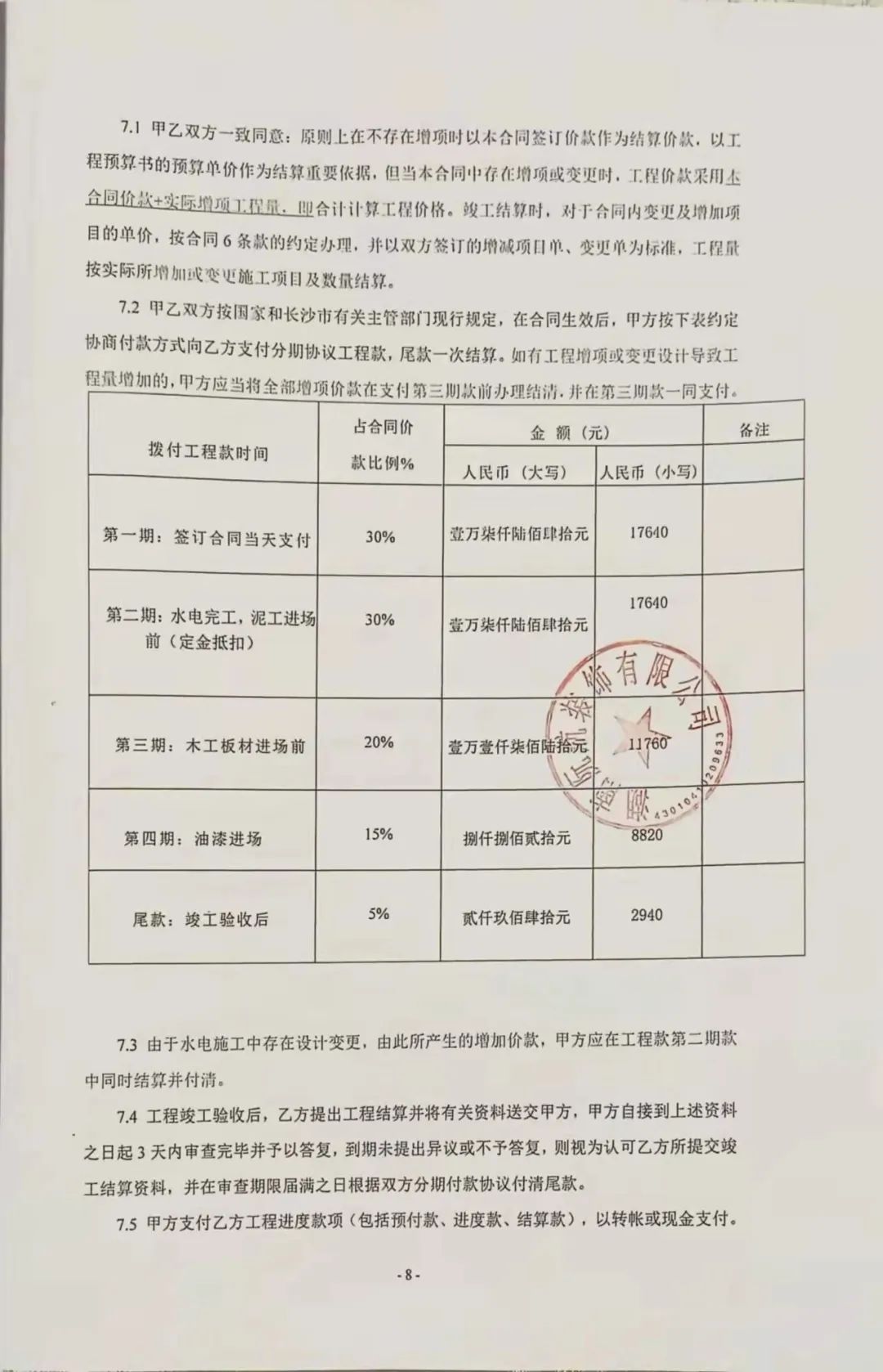 2024年8月,她和湖南阮航装饰有限公司签订装修合同,由该公司对剩下部分进行装修,约定当年9月1日开工,工期90天。按施工进度分期付款,总价5.8万余元。