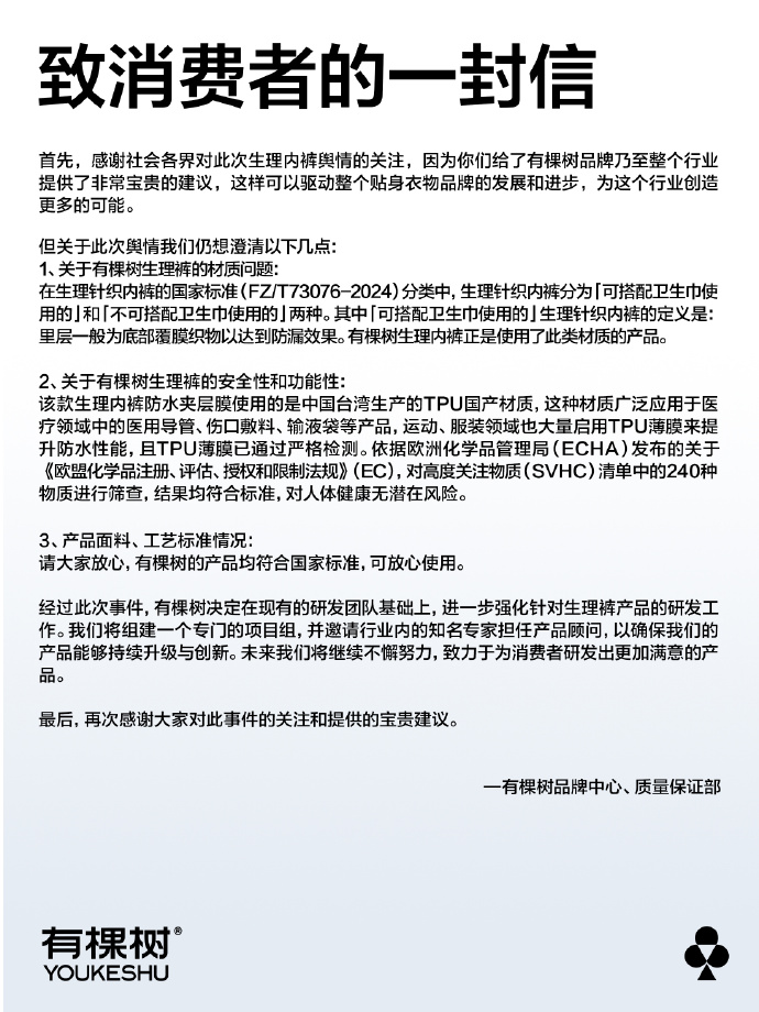 针对“有棵树生理期内裤‘里面加了一层塑料膜’”一事,1月7日凌晨,微博账号@YOUKESHU有棵树 发布《致消费者的一封信》进行回应。信中称,感谢社会各界对此次生理内裤舆情的关注,关于此次舆情想澄清以下几点: