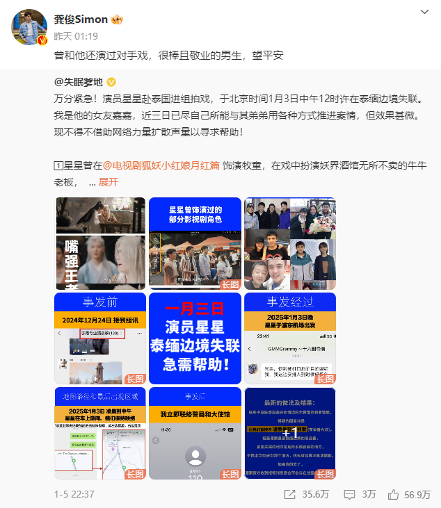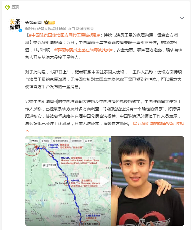 1月6日晚,泰国电视台在社交平台发布消息,称泰国警方掌握了失联演员王星的下落,目前正在赶往缅甸地区协调后续行动。