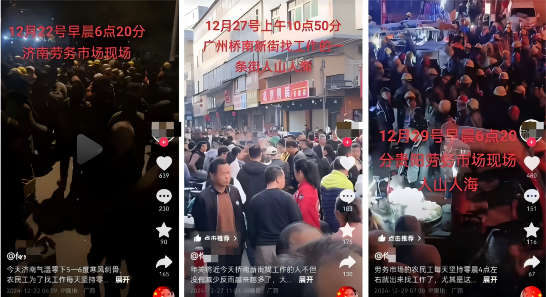 一个广西IP的网友,一周里频频发视频表示济南、广州、贵阳的劳务市场人山人海。