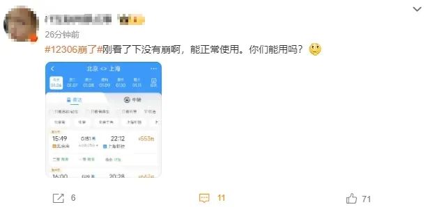 6日下午,有网友在社交平台发文称“12306崩了”,无法购买车票,还有网友称“买票钱付完看不到购票记录”。