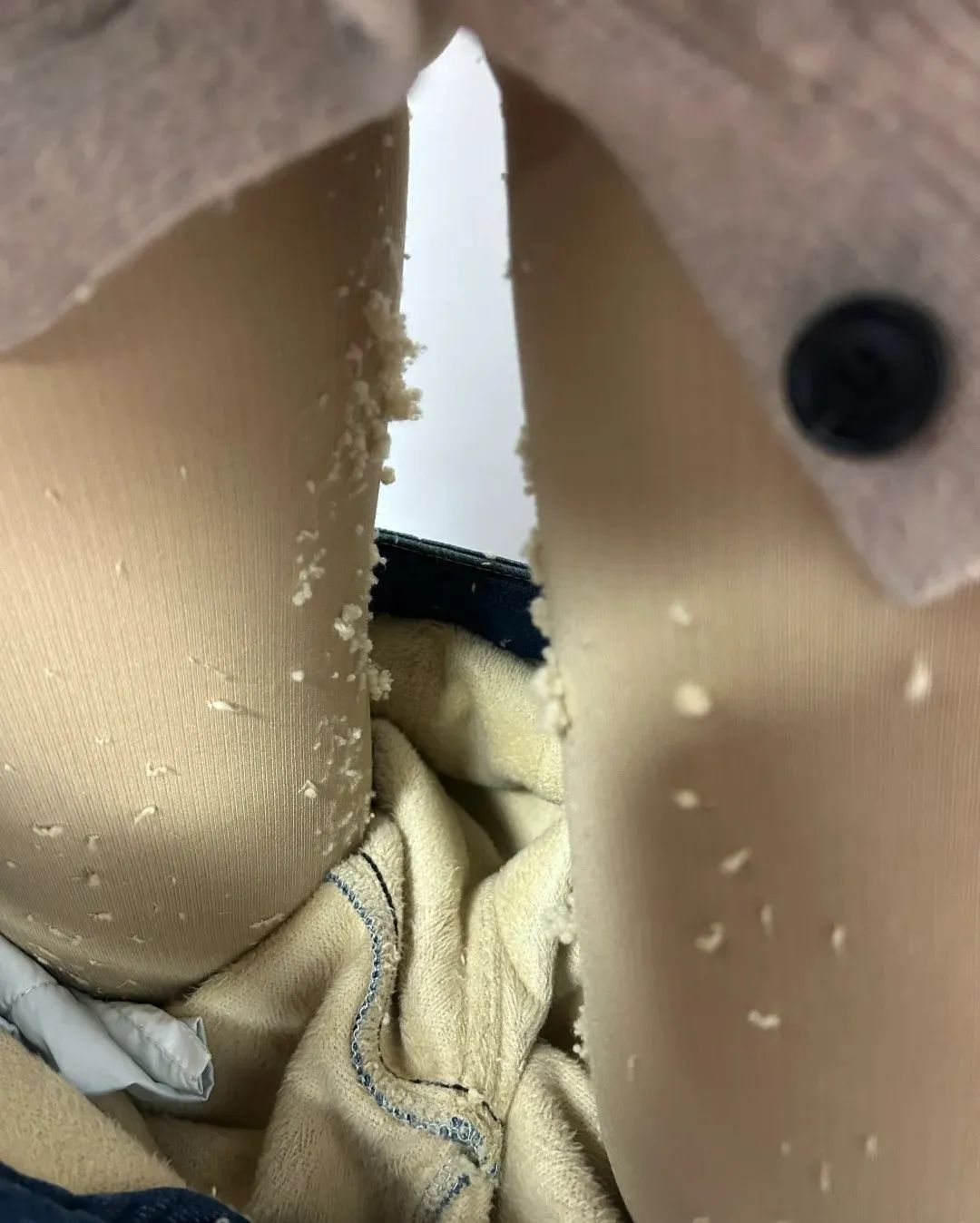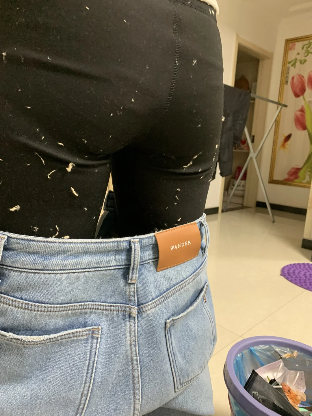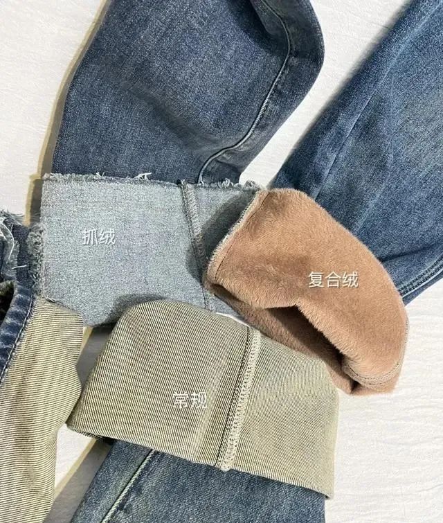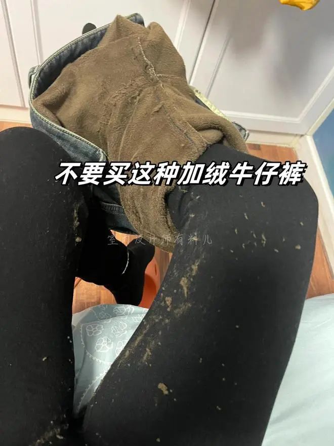 2、劣质加绒牛仔裤 特点:外层为牛仔布,内层为加绒材质,保暖性强但成本较低。 危害: 多数加绒牛仔裤采用复合绒,容易因劣质胶水引发健康问题。 长时间穿着可能导致呼吸道不适,皮肤敏感者还可能出现红疹或湿疹。 警惕信号: 脱下后绒毛残留在皮肤或衣物上。 洗涤后掉色严重或绒毛脱落明显。