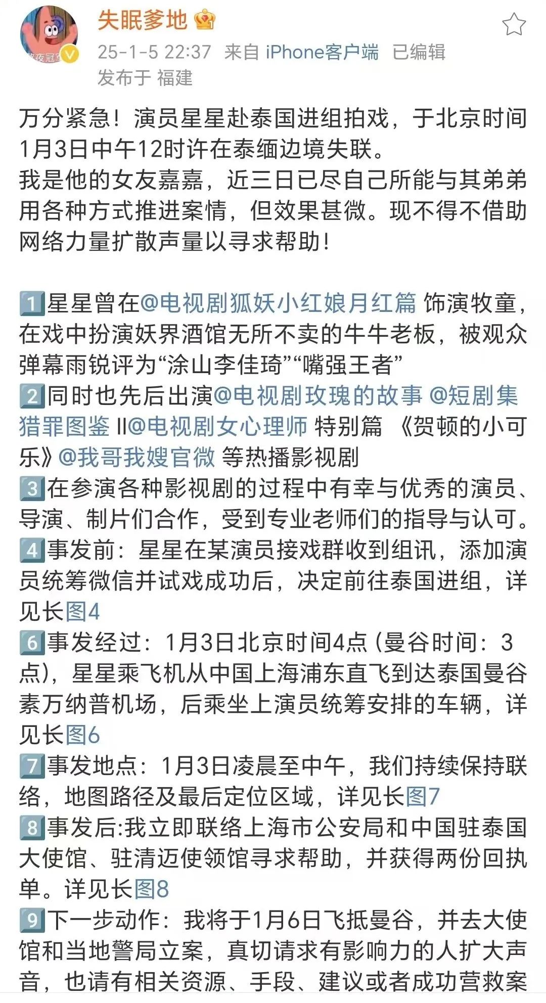 她说自己的男友是一名演员,名叫王星,远赴泰国拍戏,结果于1月3日在中泰边境失联,希望通过网络力量寻得帮助。
