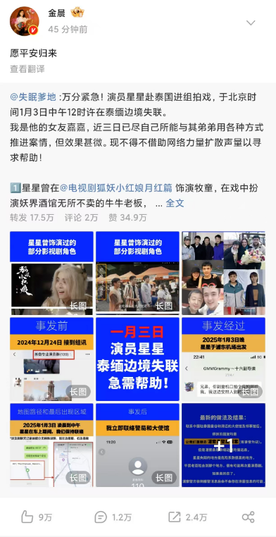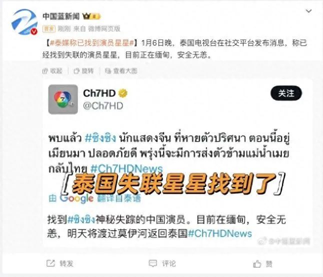 不幸中的万幸,在巨大的舆论压力下,王星终于有了消息。1月7日,泰国电视台在社交平台发布消息,称已经找到失联的演员星星。