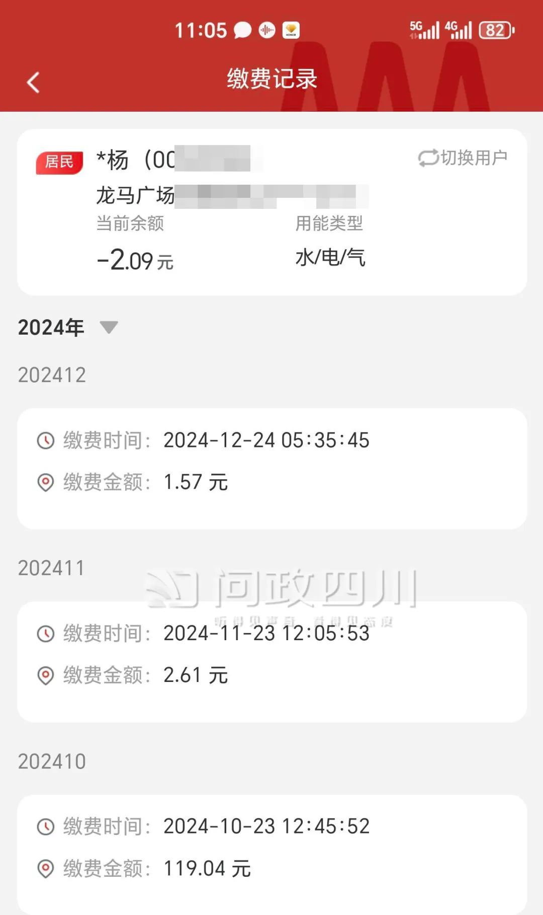 记者查询“问政四川”发现,1月11日,爱众服务公司对多条网友留言进行了回复。其中有网友表示,“房子几年都无人居住,所有水电气都关了的。但每月都有或多或少的费用产生。”爱众服务公司对此回复称,“经核实,您反映的电费是家中电器未关闭产生电量导致。经沟通解释,您表示理解与认可。”