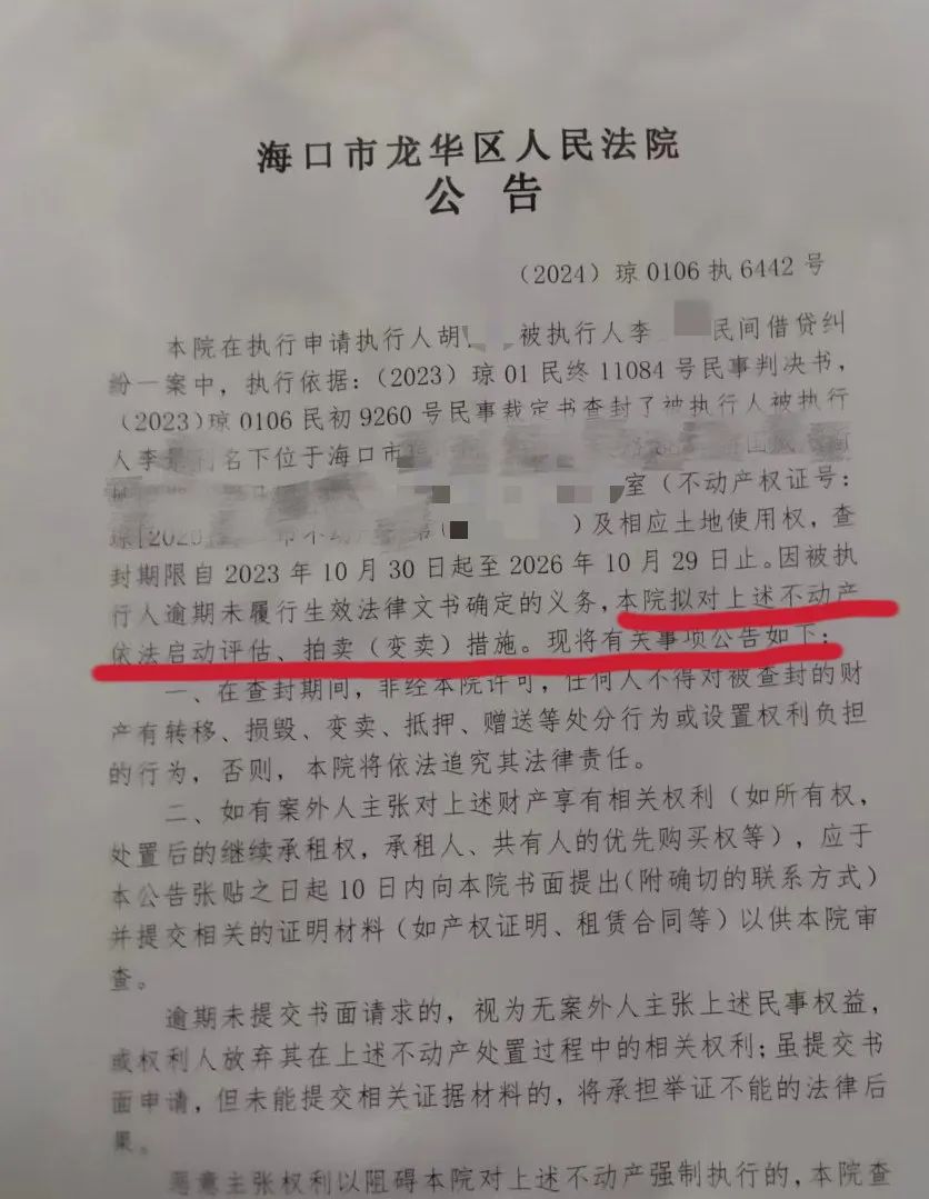 北京的李先生在网上晒出了他收到的一份来自海口市龙华区人民法院的公告,公告中显示,他在海南海口购置的一套房产将被法拍。李先生感到很震惊,“这是我在2016年买的房子,常年空置。2025年1月5日,物业给我发通知说我的房子被查封了,在走法拍程序。从查封文件看,这房子已经具备了法拍的条件,随时可以执行。另一方面文件告知案子已经二审判决了,无转圜余地,而我却毫不知情,没有接到过一个法院电话。因是周末,无法联系法院人员进行沟通,李先生紧急求助律师。律师看到判决书,认为涉案金额大的话,可能还要面临更多的经济问题。”李先生赶忙查询银行卡,发现银行卡并未被冻结。
