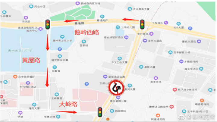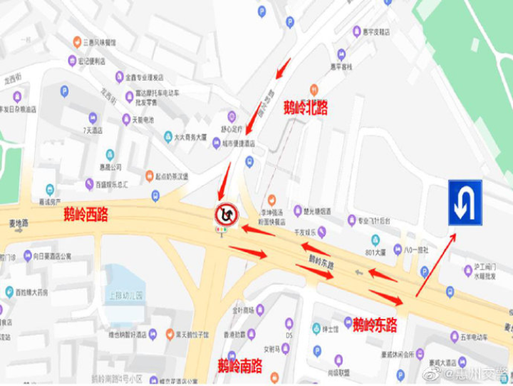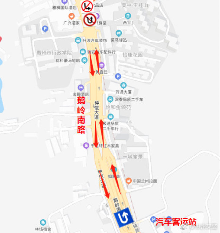 惠州车主注意啦! 11月23日起, 市区鹅岭南路及周边路段 交通组织要进行试行调整 桥东水东街改造工程施工 需围蔽部分道路, 以上路段走法有变, 大家经过的时候需要注意啦! 鹅岭南路及周边路段 具体调整如下 ↓↓↓ (一)鹅岭南路/鹅岭东路路口由北往南方向(市中心人民医院往仲恺)禁止掉头,掉头车辆可绕行鹅岭东路至原市汽车客运总站原有掉头口进行掉头。(详见交通组织示意图1) (交通组织示意图1) (二)鹅岭南路/大岭路路口由北往南(市中心人民医院往仲恺)掉头口封闭,掉头车辆可通过鹅岭西路-黄屋路-大岭路绕行。(详见交通组织示意图2) (交通组织示意图2)