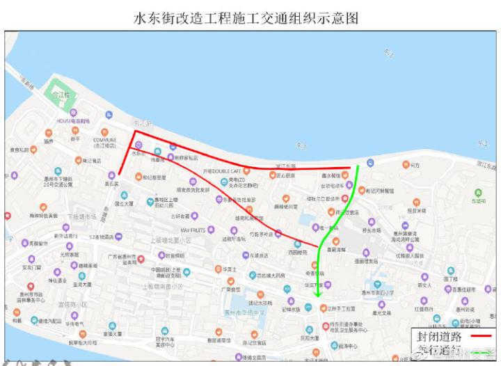 (交通组织示意图3) 水东街改造工程施工交通组织调整如下 ↓↓↓ 时间:2020年11月23日至施工结束(工期预计20天)。 施工期间,滨江东路(东江沙至新建路段)、水东东路、新建路(上塘街至滨江东路路段)实施全封闭,禁止机动车通行;东江沙、水东南路调整为由北往南单向通行,非机动车保留双向通行;下塘街、滨江东路严禁车辆停放。 (水东街改造工程施工交通组织示意图) 请大家提前规划选择合适的路线出行。 途经施工路段的车辆要按照交通标志, 减速慢行, 并服从现场工作人员的指挥疏导。 来源:惠州头条app |