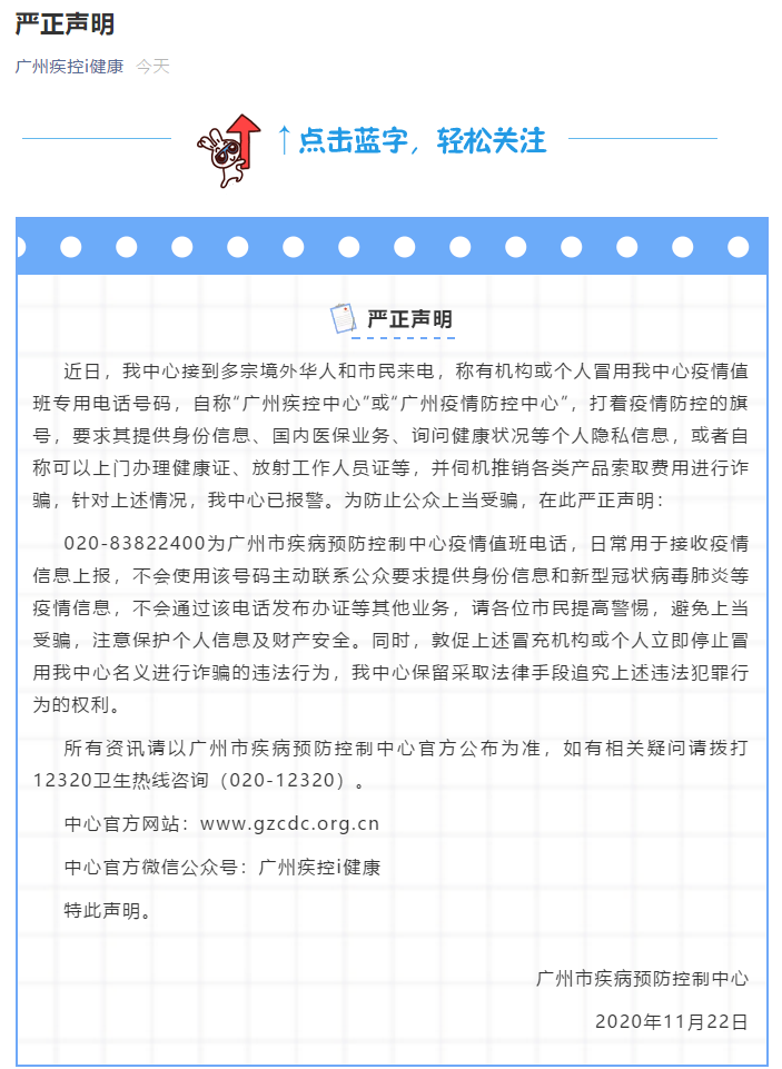 11月22日,广州市疾病预防控制中心通过其微信公众号“广州疾控i健康”发布《严正声明》称,
