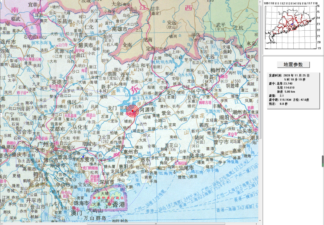 据中国地震台网测定,北京时间2020年11月25日5时10分19秒在广东河源市源城区(北纬23.74度,东经114.61度)发生M2.1级地震,震源深度5千米。震中距东莞约119公里,我市黄江、东城、虎门地震综合观测站分别于5时10分39秒、5时10分39秒、5时10分40秒接收到该地震波。