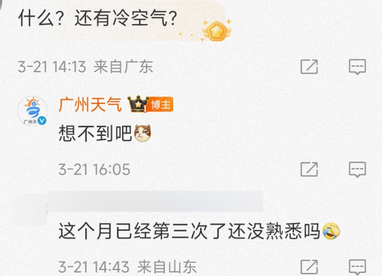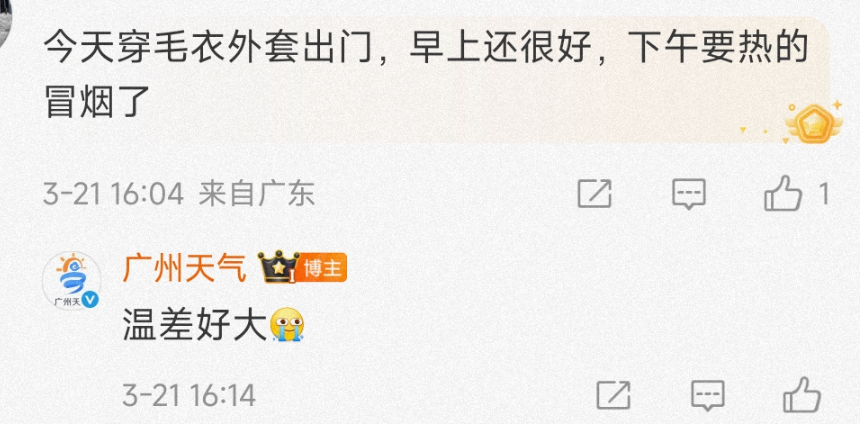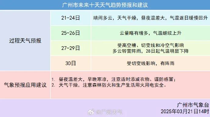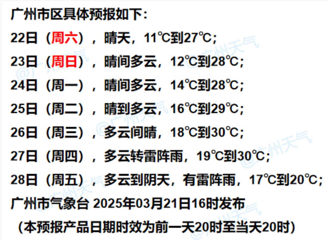 随着气温回升, 穿短袖出街的小伙伴更多了。 天气都热成这样了, 夏天快要来了吧? 还真不好说! 下周又有新阿冷杀到, 将给广州带来明显降温, 一起来看 ↓↓↓ 又热又干,最高气温30℃+! 广州多区升级森林火险预警级别 最近的天气真是又干又热, 有网友鼻子已经干得出血了! 昨天14时50分 花都区花东镇山前大道 录得该时点广州最高气温30.1℃。 近期天气干燥, 昨天广州市多区 森林火险黄色预警信号 升级为橙色。 27日起又有新阿冷要来! 接下来的天气节奏是: 下周前期(24-26日)气温逐日回升, 27日起又有新阿冷要来~ 总结就是: 热热热→冷冷冷 晴晴晴→雨雨雨 短袖→厚衣服 广东省气象台预计, 3月21日—24日, 广东大部天晴干燥, 气温继续回升, 昼夜温差较大, 部分市县早晚有轻雾。 广东具体预报: •3月22日,全省晴间多云,南部的部分市县早晚有轻雾。早晨最低气温:粤北、粤东和珠江三角洲北部市县7~11℃,粤西沿海市县15~18℃,其余市县11~15℃。 •3月23日,粤北市县多云,其余市县晴到多云,部分市县早晚有轻雾。早晨最低气温:粤北、粤东和珠江三角洲北部市县9~13℃,粤西沿海市县15~18℃,其余市县15~18℃。 •3月24日,全省大部晴间多云,部分市县早晚有轻雾。早晨最低气温:粤北、粤东北部和珠江三角洲北部市县12~15℃,其余市县15~20℃。 广州市气象台预计 未来一周,广州晴朗干燥, 昼夜温差大,气温逐日上升。 3月27日—28日转雷雨, 28日气温下降。 广州天气预报: 文章来源于广州日报,如有侵权请联系删除 |