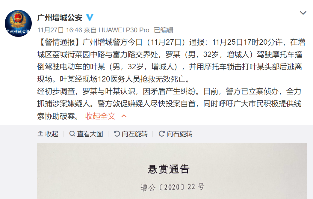 近日,广州增城区荔城街菜园中路与富力路交界处,一辆摩托车撞倒电动车后,摩托车驾驶人竟用车锁将骑电动车男子击打致死。11月27日警方发出协查通告对罗某实施抓捕。 广州增城警方11月27日通报:11月25日17时20分许,在增城区荔城街菜园中路与富力路交界处,罗某(男,32岁,增城人)驾驶摩托车撞倒驾驶电动车的叶某(男,32岁,增城人),并用摩托车锁击打叶某头部后逃离现场。叶某经现场120医务人员抢救无效死亡。 经初步调查,罗某与叶某认识,因矛盾产生纠纷。目前,警方已立案侦办,全力抓捕涉案嫌疑人。警方敦促嫌疑人尽快投案自首,同时呼吁广大市民积极提供线索协助破案。 来源:信息时报 |