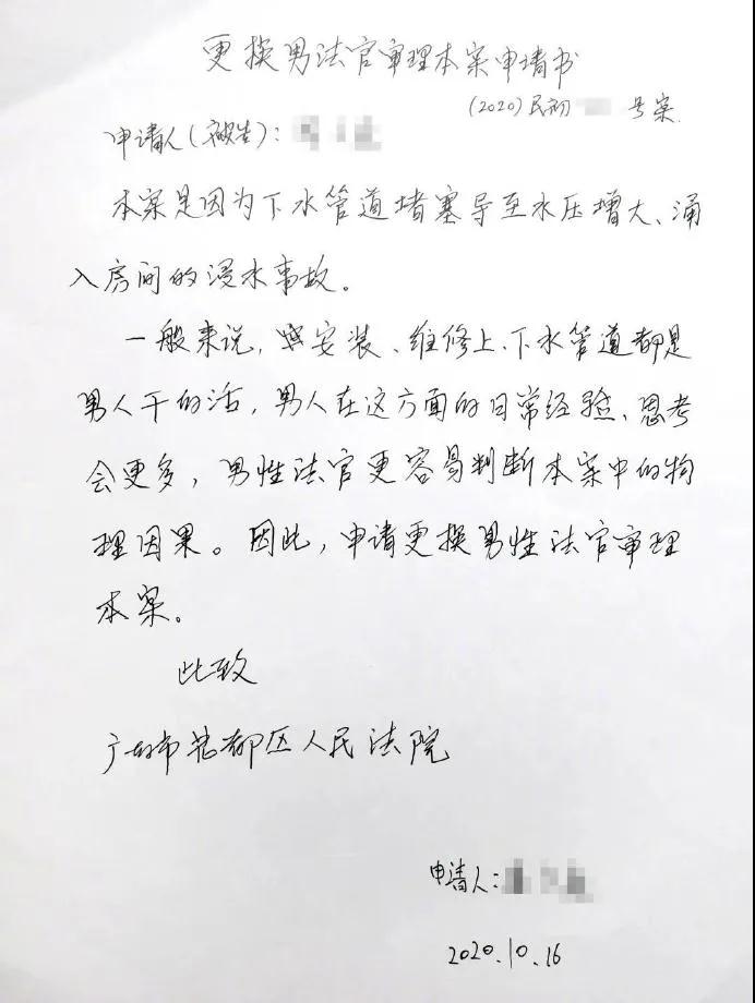 : 近日,广州花都区人民法院在审理原告石某与被告某物业公司、潘某、某摄影店房屋租赁合同纠纷一案中,被告潘某在庭询时当场提交回避申请书,要求更换男法官审理本案。理由是本案属于下水管道堵塞导致渗水事故引起的纠 ...