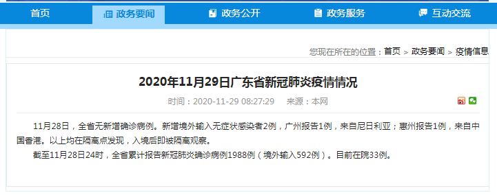 11月28日,全省无新增确诊病例。新增境外输入无症状感染者2例,广州报告1例,来自尼日利亚;惠州报告1例,来自中国香港。以上均在隔离点发现,入境后即被隔离观察。 截至11月28日24时,全省累计报告新冠肺炎确诊病例1988例(境外输入592例)。目前在院33例。 11月28日0—24时,惠州市报告1例境外输入无症状感染者,在集中隔离医学观察场所发现。该无症状感染者为男性,中国籍,从香港经深圳湾口岸入境抵惠,入境后按全程闭环管理程序转运至集中隔离医学观察场所,后转至定点医院观察治疗,目前情况稳定。 疫情防控常态化,筑牢防线不放松。一线工作人员在努力,我们每个人也要做好个人防护,科学佩戴口罩、保持社交安全距离、不扎堆、讲卫生,疫情防控仍然不能松懈。 疫情防控还不能松懈, 大家要戴好口罩, 做好个人防护哦! 来源:健康惠州 |