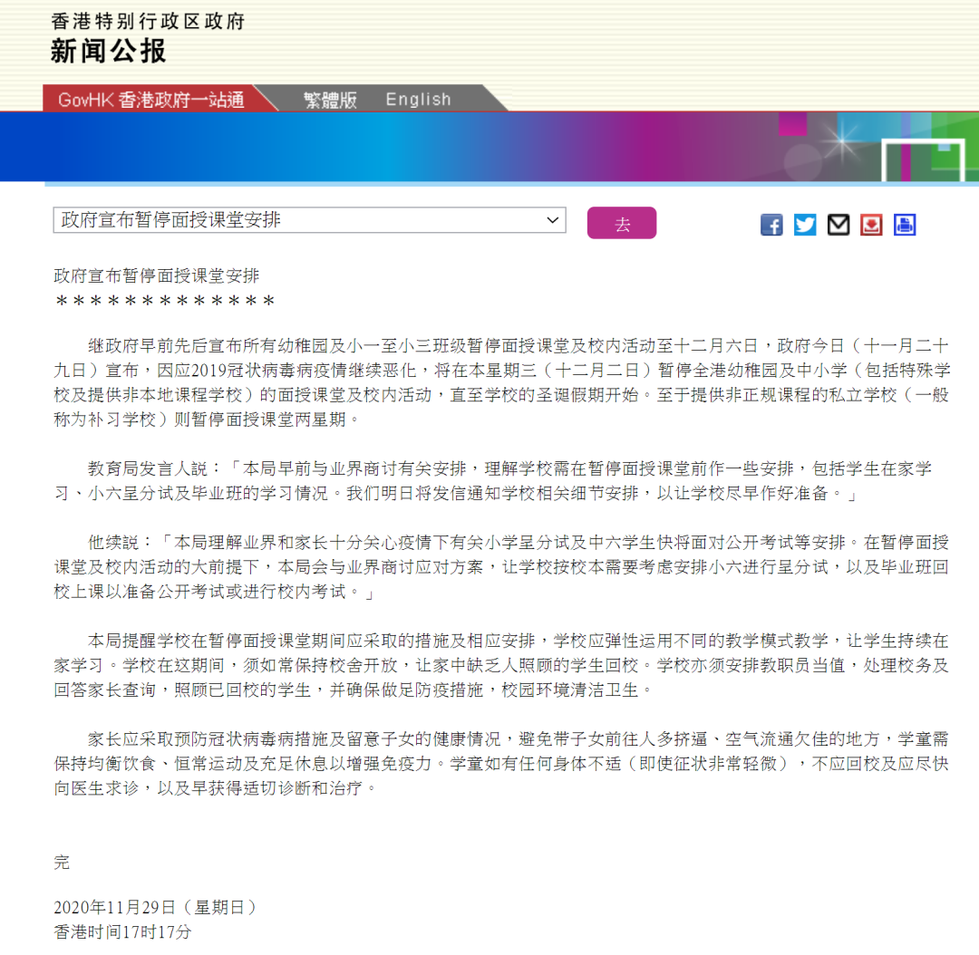 特区政府宣布,自12月2日起暂停全港幼儿园及中小学的面授课堂及校内活动,直至学校的圣诞假期开始,补习学校则暂停面授课两周。