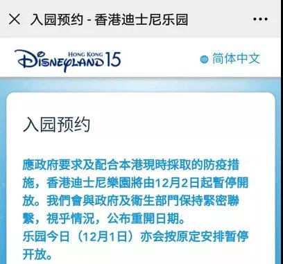 因应新冠肺炎疫情再度严峻,香港特区政府11月30日宣布新一轮防疫措施,包括公众娱乐场所12月2日起须暂停营业两周。由于香港海洋公园和香港迪士尼乐园属于公众娱乐场所,两大主题公园也将关闭,这将是两大主题公园在年内的第三次暂时关闭。香港特区政府食物及卫生局局长陈肇始当天在记者会回应记者提问时表示,新的防疫安排下,香港迪士尼乐园和香港海洋公园须关闭。香港海洋公园回应表示,公园将于12月2日起暂停开放,直至另行通知。已于公园售票处或官方网站购买受影响日期之入场门票或报名参加公园活动的访客,可保留相关门票及登记确认通知书,日后直接联络公园换票或退款。香港迪士尼乐园也在官方微信号上发布最新资讯,应政府要求及香港现时采取的防疫措施,乐园将于明天起暂停开放。而乐园今日(12月1日)也会按原定安排暂停开放。