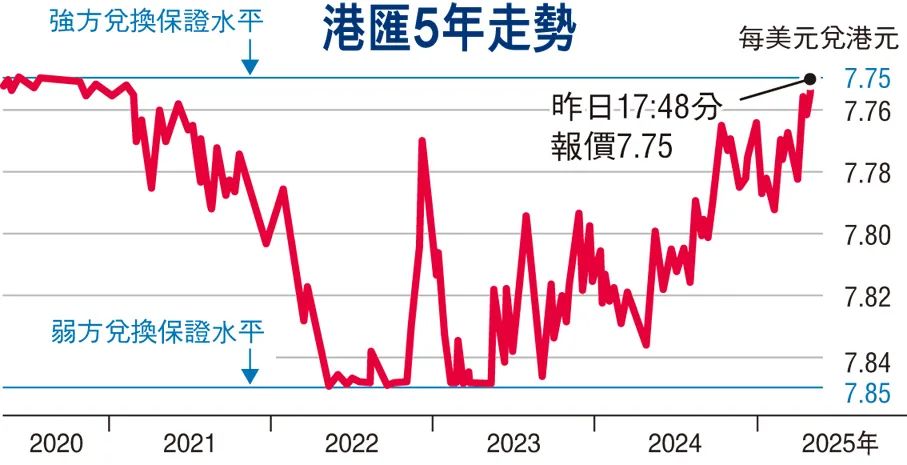 就在昨天(5月5日)傍晚,港元兑美元汇率升至7.75,触及强方兑换保证水平。