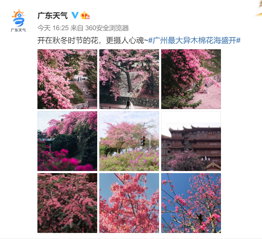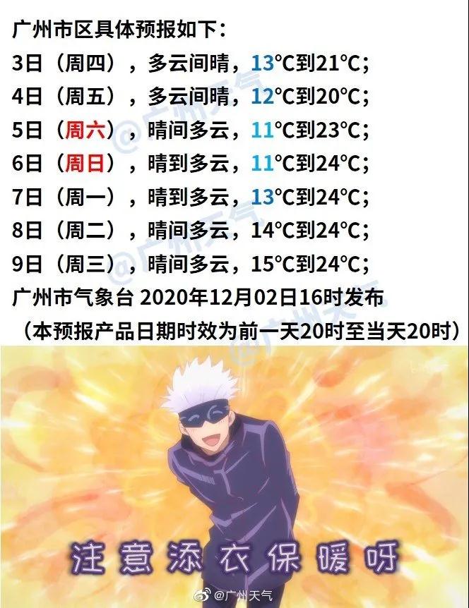 大家好, 记得前不久 我们还在说 “全国都在瞒着广东过冬” 没想到: 11月的尾巴 迎来了一股凉意十足的冷空气 在北风的加持下 小伙伴们纷纷穿上了 期盼已久的秋装或冬装 感觉就好比广东一夜入冬了! 慢着慢着 广东明明才刚成功组团“入秋” 关于“入秋”的标准 你们还记得么 ↓↓↓ 入秋标准:根据“气候季节划分”标准(QX/T 152-2012)规定:连续5天的5日滑动平均气温≤22.0℃,则以对应的气温序列中第一个≤22.0℃的日期作为秋季起始日。 小问答: 你知道今年广州是什么时候入秋的吗? 答案是:10月18日。 为何时隔一个多月才官宣“广州入秋”呢? 对此,广州市气象台称, 因今年入秋时间较常年 平均入秋时间11月9日 偏早了15天以上, 根据《气候季节划分》要求, 需进行入秋时间的二次判断。 说真的, 这次的冷空气真得要给个好评哈 除了让咱们成功“入秋”、穿上秋装以外 它还强势驱赶了嚣张多时的蚊子 让咱们过上“一蚊不吱”的生活 这样的天气 难道不值得五星好评? 最近 广州的异木棉盛开了 就在这秋冬之际 更美了 晴朗干燥的天气已经持续了很长时间 还有12个市县滴雨未下 Q1 气温偏高 据广东省气候中心统计:11月,我省月平均气温21.4℃,较历史同期(19.3℃)偏高2.1℃,破历史同期最高纪录; Q2 降水显著偏少 全省平均月降水量2.8毫米,较历史同期(39.5毫米)偏少93%,其中怀集、开平、茂名、丰顺、廉江、云浮、信宜、高州、德庆、汕尾、连南、化州共12个市县在11月甚至是滴雨未下。 确认过眼神,是生活在同一个广东~ 12月已开篇 未来的天气又会是怎样? 马上为你揭晓: 预计,新一股弱冷空气将于3日白天南下补充影响,我省气温小幅下降,过程最低气温将出现在5日(周六)早晨,广州低至11℃,粤北山区低至5℃以下。保暖衣物和厚被子都洗晒好了么~ 3日 我省大部多云到阴天。最低气温:粤北大部、珠三角北部7℃~11℃,南部沿海市县14℃~17℃,其余市县12℃~14℃。 4-5日 我省大部晴到多云。最低气温:粤北、肇庆、云浮、珠三角北部市县6℃~10℃,南部沿海市县13℃~16℃,其余市县11℃~13℃。 6-7日 全省大部晴间多云,粤北山区局部有5℃左右低温。 在这股冷空气影响过后 广州天气慢慢回暖 直到12月11日,才会再有新冷空气南下 不过…… 11月气温偏高破纪录,12月广东将会偏冷 12月冷空气来得更勤快 预计有4次冷空气过程 气象部门预计,与历史同期相比,12月的月平均气温整体偏低0.1~0.5℃。 本月广东主要有4次冷空气过程 最低气温方面全省偏低0.1~0.5℃。月内主要有4次冷空气过程,大致出现在