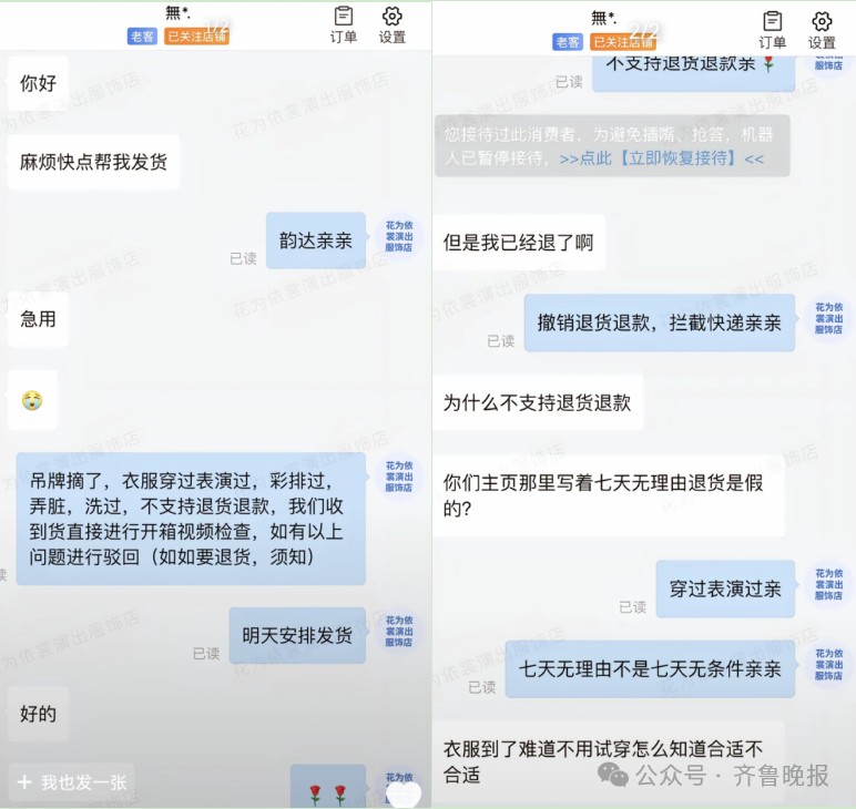 然而,演出结束后,买家却以“七天无理由退货”为由申请退款。店主以穿过为由拒绝退货,买家辩解“衣服不试穿怎么知道合适不合适”,即便店主发送学校演出视频作为证据,买家仍坚称“七天无理由为什么不能退”。