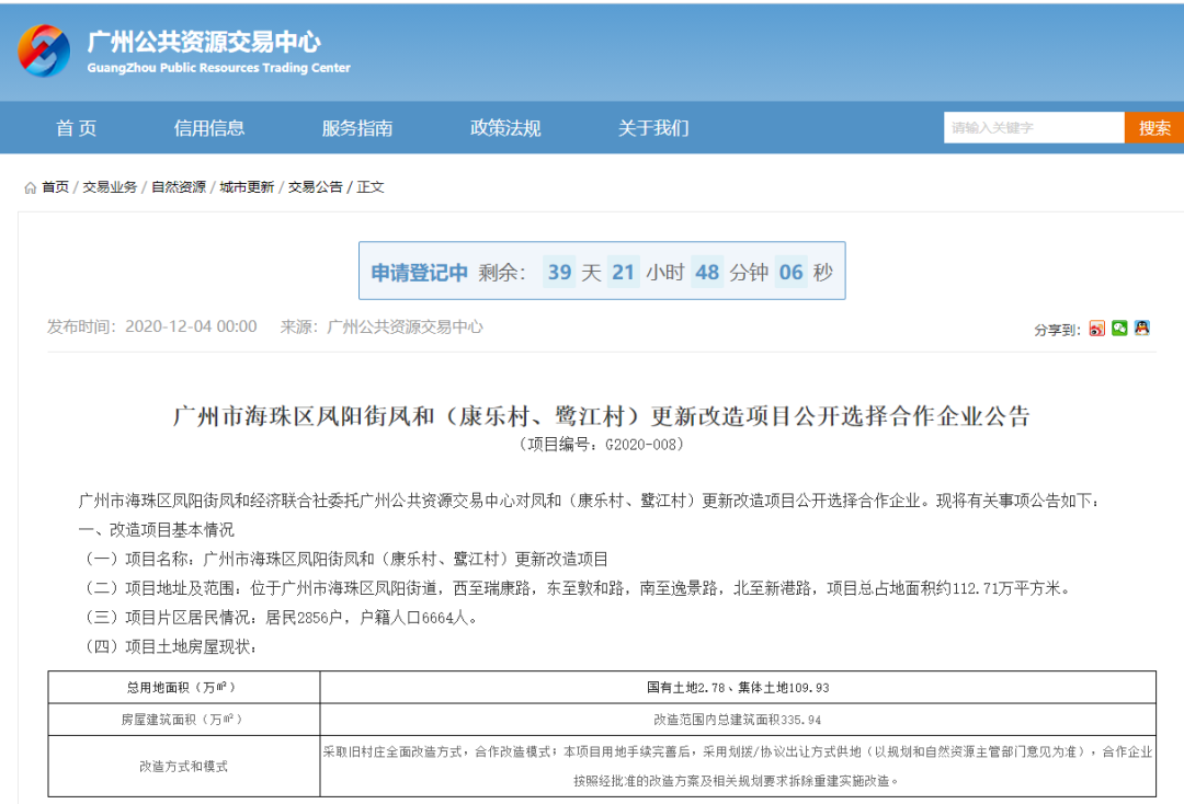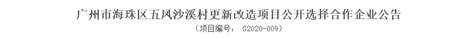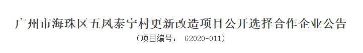 广州海珠区三天时间, 五条城中村改造公开招合作房企, 拆迁改造面积达201.59万平方米, 投资金额达575.57亿元! 上周五,广州公共资源交易中心公布了《广州市海珠区凤阳街凤和(康乐村、鹭江村)更新改造项目公开选择合作企业公告》,项目总占地面积约112.71万平方米,项目改造投资总金额约为346.67亿元。 前日,广州公共资源交易中心又再公布了《广州市海珠区五凤五村更新改造项目公开选择合作企业公告》、《广州市海珠区五凤沙溪村更新改造项目公开选择合作企业公告》、《广州市海珠区五凤泰宁村更新改造项目公开选择合作企业公告》,三条村项目总占地面积约88.88万平方米,项目改造投资总金额约为228.9亿元。 该项目位于广州市海珠区凤阳街道,西至瑞康路,东至敦和路,南至逸景路,北至新港路,片区居民居民2856户,户籍人口6664人。总占地面积约112.71万平方米(国有土地2.78万平方米、集体土地109.93万平方米),改造范围内总建筑面积335.94万平方米,改造投资总金额约为346.67亿元,当中复建安置资金约250.77 亿元;项目交易保证金5亿元人民币。 竞得人应优先进行复建安置房建设,确保按时安排村民回迁;同时,根据经批复的改造实施方案的要求,竞得人应严格按照《合作框架协议》妥善开展拆迁补偿安置工作。交易发起人及改造范围内村民按照《合作框架协议》享有拆迁安置、经济补偿等相关权益,不承担开发经营风险。 此外,竞得人应与政府相关部门签订监管协议和承诺书,明确产业导入的内容与要求,保证项目建成后产业导入有实质性成效;竞得人需承建华盛南路道路大修工程(项目金额约1600万元)、叠景路临时维修工程(项目金额约1000万元)、凤江小学校园综合改造提升工程(项目金额约2500万元)、客村小学校园综合改造提升工程(项目金额约2500万元)、逸景第一小学本校区校园综合改造提升工程(项目金额约2400万元)公益建设项目。 同意按照市、区下达的任务节点要求完成改造各项工作,确保2023年底前安置房开工建设,2025年底前基本完成安置房建设。具体节点任务要求如下: 确保2020年11月30日前完成编制单位的确定并启动详细规划修改方案编制工作; 2021年3月31日前完成合作企业公开引入工作; 2021年6月30日前完成片区策划方案、详细规划修改方案审批; 2021年12月31日前完成实施方案审批、完成补偿安置方案表决并启动补偿安置协议签约; 2022年6月30日前完成首期安置地块上房屋的补偿安置协议签约、全村改造范围内房屋的签约率达到50%以上; 2022年9月30日前完成首期安置地块上的房屋动迁交房; 2022年10月31日前完成首期安置地块上的房屋拆卸; 2022年12月31日前基本完成签约工作,首期安置房开工建设; 2023年9月30日前完成全部安置地块上的房屋动迁交房; 2023年10月31日前完成全部安置地块上的房屋拆卸; 2023年12月31日前全部安置房开工建设; 2025年12月31日前基本完成安置房建设。 该项目改造范围是广州市海珠区凤阳街道,东至瑞康路以东,西至东晓南路,南至新滘西路,北至凤景西路,片区居民747户,户籍人口1831人。项目总用地面积33.3万平方米(国有土地 0.21万平方米 ,集体土地 33.09万平方米),改造范围内总建筑面积51.02万平方米,改造投资总金额暂估约79.89亿元,当中复建安置资金约63.91亿元。项目交易保证金3亿元。 该项目项目改造范围广州市海珠区凤阳街道,东至东晓南路,西至江燕路,南至新滘西路,北至江泰路,片区居民824户,户籍人口1736人。总用地面积43.61万平方米(国有土地0.26万平方米,集体土地43.35万平方米),改造范围内总建筑面积74.94万平方米,改造投资总金额暂估约110.80亿元,当中复建安置资金约88.64亿元。项目交易保证金3亿元人民币。 该项目改造范围广州市海珠区凤阳街道 ,东至东晓南路,西至江燕路,南至江泰路,北至晓港中马路,片区居民604户,户籍人口1401人。总用地面积11.97万平方米,改造范围内总建筑面积31.75万平方米,改造投资总金额暂估约38.21亿元,其中复建安置资金约30.57亿元。项目交易保证金3亿元人民币。 根据周六公布的三份公告显示,五凤五村、五凤沙溪村、五凤泰宁村项目改造采取旧村全面改造方式,通过合作改造的模式进行分期分批拆迁,竞得人应优先进行复建安置房建设,确保按时安排村民回迁;同时,根据经批复的改造实施方案的要求,竞得人应严格按照《合作框架协议》妥善开展拆迁补偿安置工作。交易发起人及改造范围内村民按照《合作框架协议》享有拆迁安置、经济补偿等相关权益,不承担开发经营风险。 此外,还要求竞得人获得沙溪村更新改造项目、五村更新改造项目和泰宁村更新改造项目合作改造资格后,需统筹承建以下公益建设项目:蓝天中学校园综合改造提升工程(项目金额约2000万元)、五凤小学校园综合改造提升工程(项目金额约2000万元)、晓港东马路小学校园综合改造提升工程(项目金额约3000万元)、晓园小学校园综合改造提升工程(项目金额约1000万元); 同意按照市、区下达的任务节点要求完成改造各项工作,确保2023年12月31日前安置房开工建设,2025年12月31日前基本完成安置房建设。具体节点任务要求如下: 确保2020年11月30日前完成编制单位的确定并启动详细规划修改方案编制工作;2021年3月31日前完成合作企业公开引入工作; 2021年6月30日前完成片区策划方案、详细规划修改方案审批; 2021年12月31日前完成实