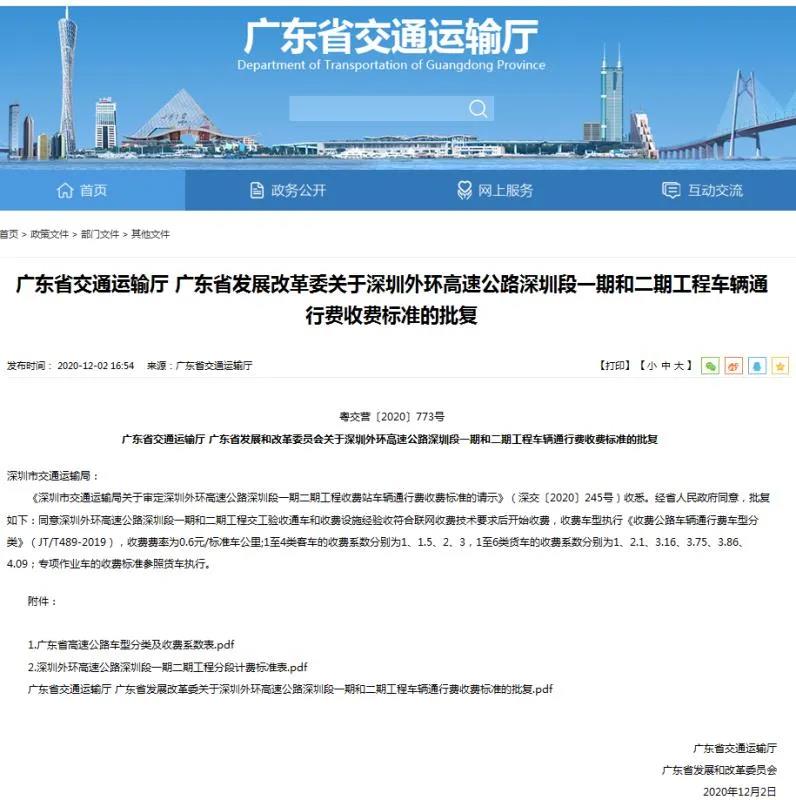 目前,外环高速公路深圳段一期工程 已经全线贯通,有望年内通车运营。 日前,广东省交通运输厅、省发展和改革委员会 最新批复收费标准! 快随小编一起来看看~ 12月2日,广东省交通运输厅、广东省发展和改革委员会关于深圳外环高速公路深圳段一期和二期工程车辆通行费收费标准的批复,经省人民政府同意,同意深圳外环高速公路深圳段一期和二期工程交工验收通车和收费设施经验收符合联网收费技术要求后开始收费,收费车型执行《收费公路车辆通行费车型分类》(JT/T489-2019): 深圳外环高速 深圳外环高速是广东省“十二纵六横十二射两环”高速公路骨架网的一条加密线,也是深圳市“十横十三纵”干线道路网的重要一横。项目由深圳段和东莞段组成,西起于广深沿江高速公路,向东经宝安区、光明区、龙华区、东莞市、龙岗区、坪山区、大鹏新区,终点接盐坝高速公路,全长约93公里,其中深圳段76公里,东莞段17公里。 ▲图片来源:宝安日报 深圳外环高速一共分3期建设 资料图(来源:深圳特区报) 期待早日通车~ 来源:深圳新闻网 |