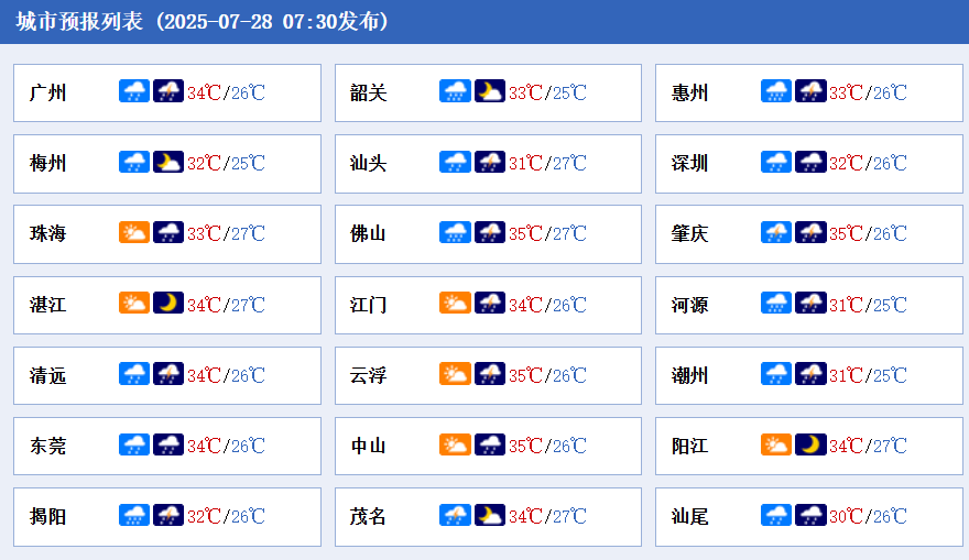 28日,粤北、粤东和珠三角有中到强雷雨局部大暴雨,粤西多云,有分散(雷)阵雨局地大雨或暴雨。最高气温:粤西、珠三角中南市县34~36℃,其余市县30~33℃。