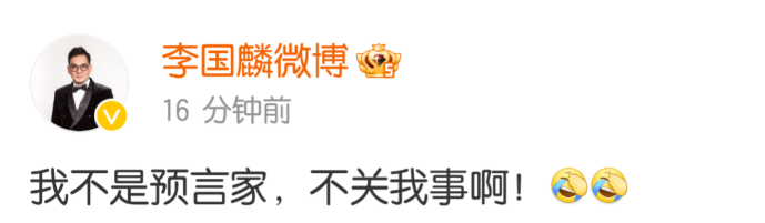 释永信被抓在网上闹得沸沸扬扬,鸠摩智扮演者微博发布信息,表示:我不是预言家,不关我事啊!