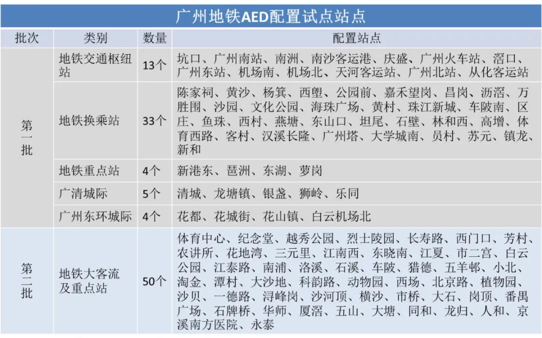 12月11日,广州地铁集团对外公布,将于12月18日起,在地铁线网交通枢纽站、换乘站等100座车站,及所运营的广清城际、广州东环城际9座车站分两批开展AED(自动体外除颤器)配置试点工作。 根据实施方案,首批AED覆盖50座地铁站,以及广清城际、广州东环城际9座车站,从12月18日起开始配置,在2021年1月31日前完成;第二批将覆盖50座地铁站,计划在2021年上半年完成;后续将在本次试点的基础上分步推广。 AED配置试点站点。图源:广州地铁微博 据广州地铁相关负责人介绍,广州地铁于10月起着手开展AED试点工作,并与广州市相关卫生主管部门、红十字会和广州悦尔公益基金会研究洽谈AED配置及人员培训等具体事宜,最终在近日形成试点实施方案。试点中,首批AED由广州市红十字会捐赠,第二批由广州悦尔公益基金会捐赠。 |