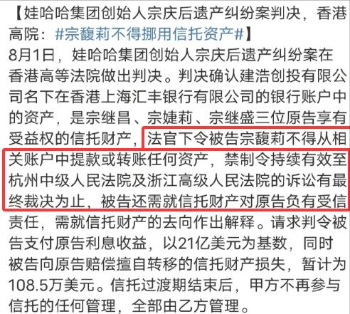 判决书上明确写着,是临时禁止令,答应了三J的申请,不让宗馥莉动用信托里的钱,但这份禁止令是有时效的,到杭州判决下来前。