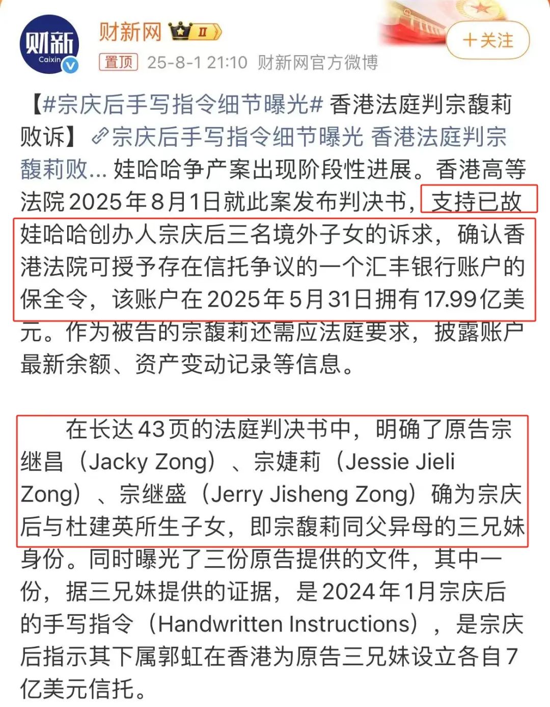 判决书刚出来,说“宗馥莉输了”的热搜就好几条,说背后没人操盘,我是不信的。