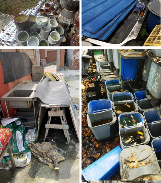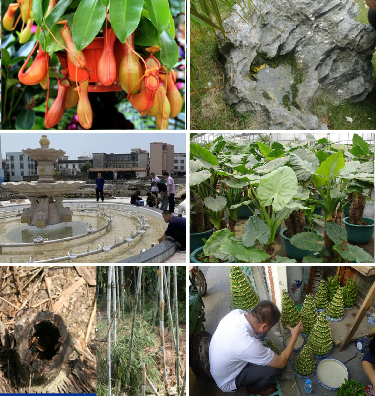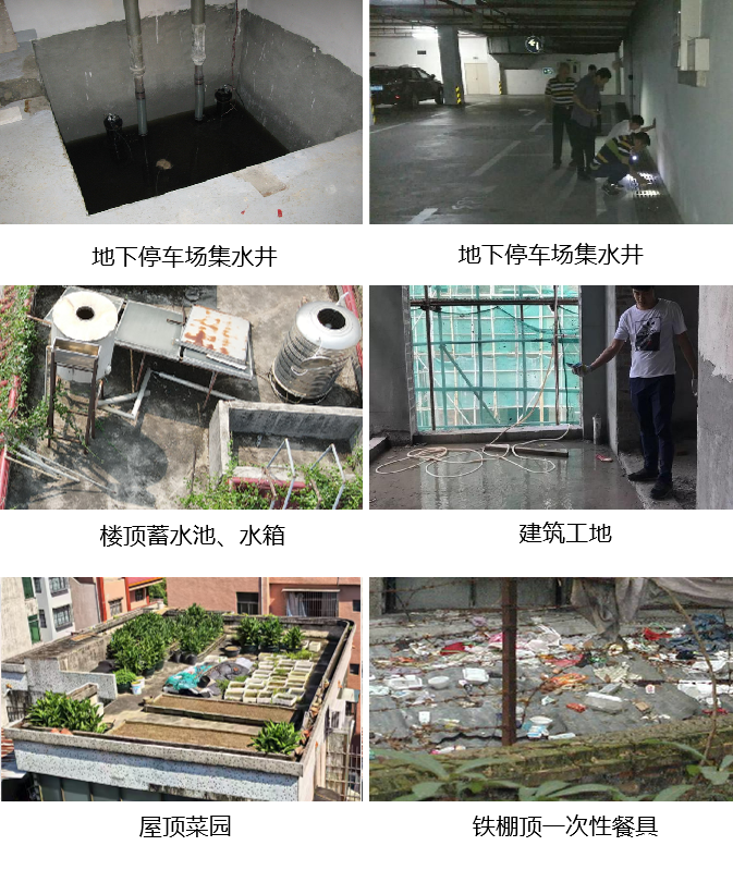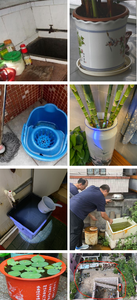 院落、楼顶、阳台、厕所、厨房等处的富贵竹、花瓶、水缸、水桶、花盆托盘等。