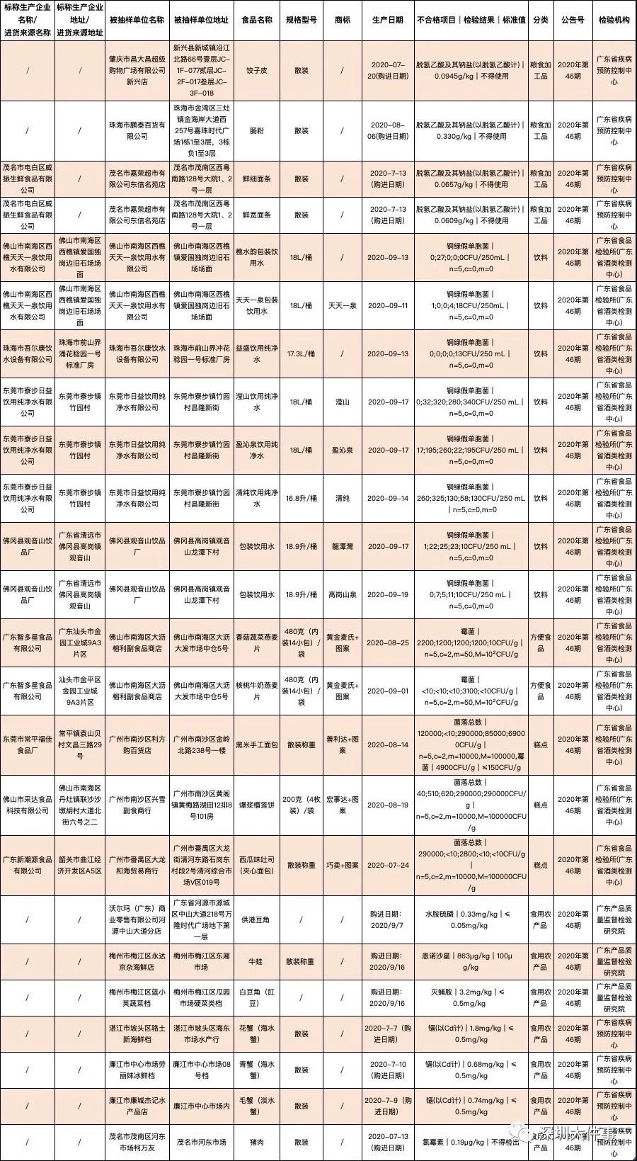 大家有没有一种感觉冷空气一来,深圳一降温 就特别地……嘴!馋! 尽情吃喝为冬季“囤膘”的时候 可先得来看看“食品安全” 最新一期食品抽检结果 新!鲜!出!炉! 快来看看哪些不能吃? 根据2020年国家和广东省食品安全监督抽检计划,广东省市场监督管理局组织抽检粮食加工品、调味品、饮料、方便食品、冷冻饮品、蔬菜制品、糕点、食用农产品、食品添加剂等9类食品826批次样品。 根据食品安全国家标准检验和判定,其中抽样检验项目合格样品802批次、不合格样品24批次。 在这些不合格食品中 包括了面包、猪肉、螃蟹等 值得留意的是 沃尔玛也有食品被检出不符合规定 一起来详细看看! 微生物污染问题: 多款饮用水、面包、麦片 不符合规定 本次抽检的饮料 主要为包装饮用水 不合格样品8批次 不合格项目为铜绿假单胞菌 (一)标称佛山市南海区西樵天天一泉饮用水有限公司生产的樵水韵包装饮用水和天天一泉包装饮用水,铜绿假单胞菌不符合食品安全国家标准规定。检验机构为广东省食品检验所(广东省酒类检测中心)。 (二)标称珠海市吾尔康饮水设备有限公司生产的益盛饮用纯净水,铜绿假单胞菌不符合食品安全国家标准规定。检验机构为广东省食品检验所(广东省酒类检测中心)。 图片来源:视觉中国 (三)标称东莞市寮步日益饮用纯净水有限公司生产的滢山饮用纯净水、盈沁泉饮用纯净水和清纯饮用纯净水,铜绿假单胞菌不符合食品安全国家标准规定。检验机构为广东省食品检验所(广东省酒类检测中心)。 (四)标称佛冈县观音山饮品厂生产的、商标为龍潭灣和高岗山泉的包装饮用水,铜绿假单胞菌不符合食品安全国家标准规定。检验机构为广东省食品检验所(广东省酒类检测中心)。 抽检的糕点主要为糕点 不合格样品3批次 不合格项目为菌落总数、霉菌 (五)佛山市南海区大沥榕利副食品商店销售的标称广东智多星食品有限公司生产的香菇蔬菜燕麦片和核桃牛奶燕麦片,霉菌不符合食品安全国家标准规定。检验机构为广东省食品检验所(广东省酒类检测中心)。 (六)广州市南沙区利方购百货店销售的标称东莞市常平福佳食品厂生产的黑米手工面包,菌落总数和霉菌不符合食品安全国家标准规定。检验机构为广东省食品检验所(广东省酒类检测中心)。 图片来源:视觉中国 (七)广州市南沙区兴雪副食商行销售的标称佛山市采达食品科技有限公司生产的爆浆榴莲饼,菌落总数不符合食品安全国家标准规定。检验机构为广东省食品检验所(广东省酒类检测中心)。 (八)广州市番禺区大龙和海贸易商行销售的标称广东新潮源食品有限公司生产的西瓜味吐司(夹心面包),菌落总数不符合食品安全国家标准规定。检验机构为广东省食品检验所(广东省酒类检测中心)。 图片来源:视觉中国 农兽药残留问题: 沃尔玛一食品不合格 (一)沃尔玛(广东)商业零售有限公司河源中山大道分店销售的供港豆角,水胺硫磷不符合食品安全国家标准规定。检验机构为广东产品质量监督检验研究院。 (二)梅州市梅江区永达京杂海鲜店销售的牛蛙,恩诺沙星不符合食品安全国家标准规定。检验机构为广东产品质量监督检验研究院。 (三)梅州市梅江区蓝小英蔬菜档销售的白豆角(豇豆),灭蝇胺不符合食品安全国家标准规定。检验机构为广东产品质量监督检验研究院。 (四)茂名市茂南区河东市场柯万友销售的猪肉,氯霉素不符合食品安全国家标准规定。检验机构为广东省疾病预防控制中心。 图片来源:视觉中国 重金属污染问题: 多款螃蟹检出“超标” 爱吃海鲜螃蟹的小伙伴也注意 多批次螃蟹抽检结果不符合规定 ▼ (一)湛江市坡头区骆土新海鲜档销售的花蟹(海水蟹),镉(以Cd计)不符合食品安全国家标准规定。检验机构为广东省疾病预防控制中心。 (二)廉江市中心市场劳丽妹冰鲜档销售的青蟹(海水蟹),镉(以Cd计)不符合食品安全国家标准规定。检验机构为广东省疾病预防控制中心。 (三)廉江市廉城杰记水产品店销售的毛蟹(淡水蟹),镉(以Cd计)不符合食品安全国家标准规定。检验机构为广东省疾病预防控制中心。 图片来源:视觉中国 最后一项是大家都很关注的 食品添加剂问题 食品添加剂超范围使用问题: 涉及饺子皮、面条、肠粉等 (一)肇庆市昌大昌超级购物广场有限公司新兴店销售的饺子皮,脱氢乙酸及其钠盐(以脱氢乙酸计)不符合食品安全国家标准规定。检验机构为广东省疾病预防控制中心。 (二)珠海市鹏泰百货有限公司销售的肠粉,脱氢乙酸及其钠盐(以脱氢乙酸计)不符合食品安全国家标准规定。检验机构为广东省疾病预防控制中心。 (三)茂名市嘉荣超市有限公司东信名苑店销售的来自茂名市电白区威振生鲜食品有限公司的鲜细面条和鲜宽面条,脱氢乙酸及其钠盐(以脱氢乙酸计)不符合食品安全国家标准规定。检验机构为广东省疾病预防控制中心。 图片来源:视觉中国 最后给大家看看不合格名单 小伙伴们可自查对比下有没有吃过 (点击图片可查看大图) ▽ 而对于这些不合格的食品 官方也出手处理! 下架、召回不合格产品 广东省市场监督管理局已要求辖区市场监管部门及时对不合格食品及其生产经营者进行调查处理,责令企业查清产品流向,采取下架、召回不合格产品等措施控制风险,并分析原因进行整改。 同时要求辖区市场监管部门将相关情况记入生
