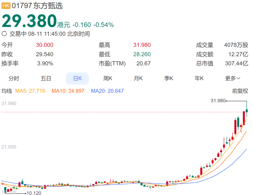 和平的“分手”并未带来应有的宁静,风波仍然持续,此后东方甄选曾多次就“抹黑董宇辉”等说法进行辟谣。当时间来到2025年8月11日。截至发稿,东方甄选股价报29.38港元,市值突破300亿港元,短短一个月,股价翻番。如果以年内最低10.12港元计,其股价涨幅达190%;若以董宇辉出走的低点8.92港元计算,东方甄选累计涨幅更是高达229%。对俞敏洪来说,一切都在向好。