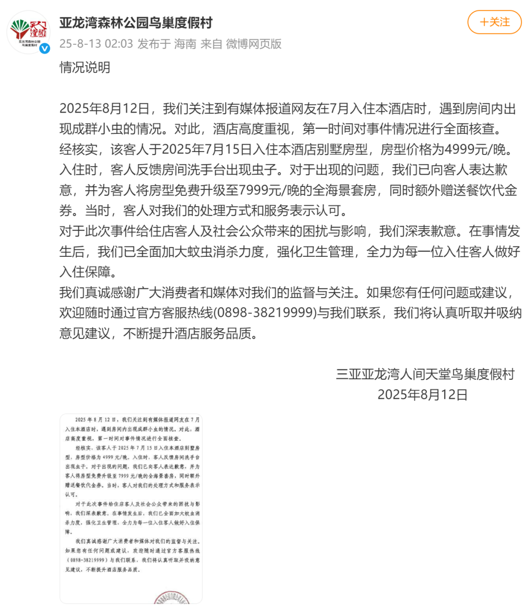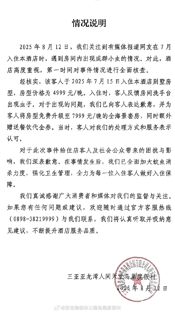 三亚亚龙湾鸟巢度假村就此事作出回应称,此事不可能是卫生原因导致的。由于涉事房间是山里,不排除与周边生态环境有关。目前,度假村对具体情况尚不知情,将在进一步核实后给出回复。 8月13日凌晨,涉事酒店亚龙湾森林公园鸟巢度假村在其官方微博发布情况说明:2025年8月12日,我们关注到有媒体报道网友在7月入住本酒店时,遇到房间内出现成群小虫的情况。对此,酒店高度重视,第一时间对事件情况进行全面核查。