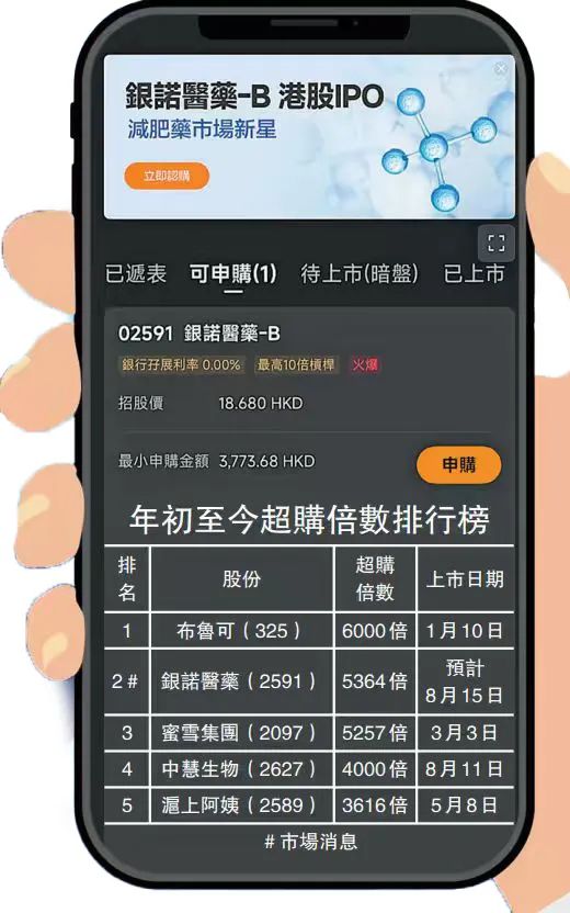 昨日(12日),港交所(388)实施新的新股回拨及定价机制后首只新股银诺医药(2591)公开发售部分截止认购。市场消息称,该股合共录得逾26万人认购,公司发售部分冻资约3700亿元,若以公开发售集资6828万元计,录得超购逾5364倍,仅次于今年初上市的布鲁可(325),暂列今年超购倍数排行榜第二。而这一切,只是香港火热的IPO市场缩影之一——今年首7个月,已有53只新股挂牌上市,而排队等候上市的公司达至210只!