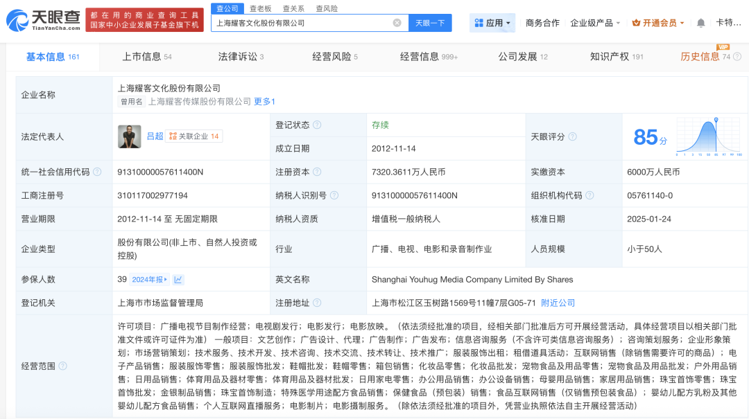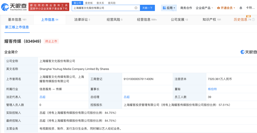【上海耀客文化股份有限公司】成立于2012年,法定代表人为吕超,业务涉及影视剧创作、制作、演出经纪等多方领域。