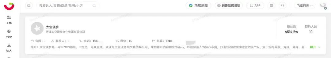 飞瓜易投官网显示,太空漫步的全称为【天津太空漫步文化传媒有限公司】,是一家以MCN孵化、IP打造、电商直播等为主营业务的文化传媒公司。