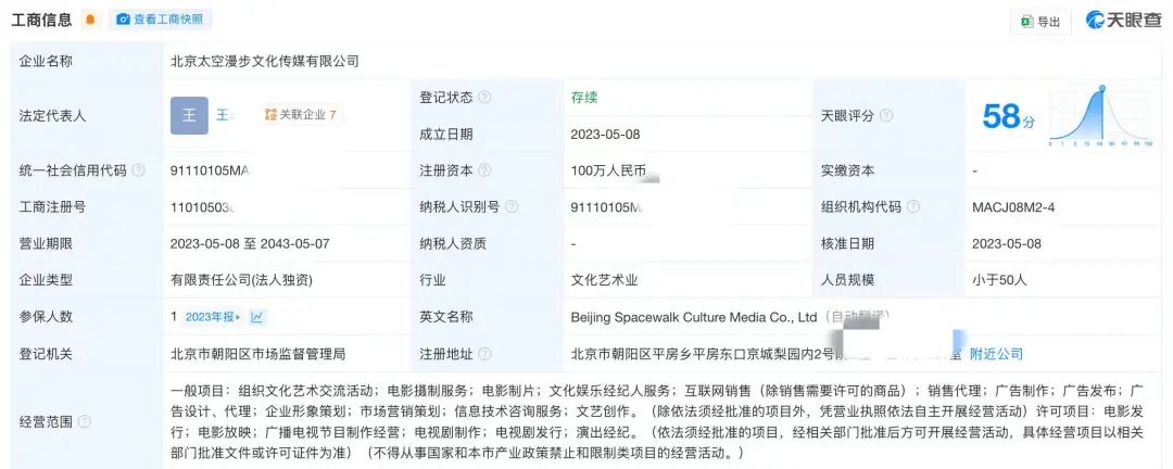 天眼查官网显示,【天津太空漫步文化传媒有限公司】成立于2019年,法定代表人为王某环。